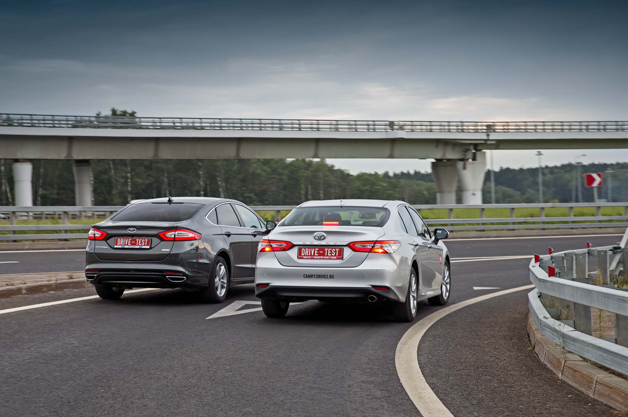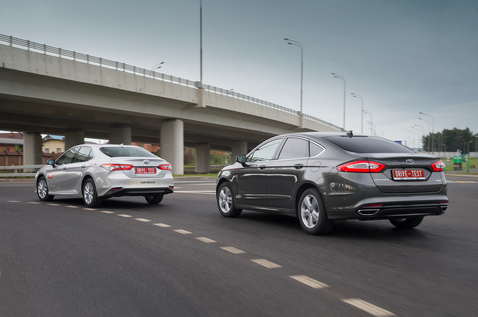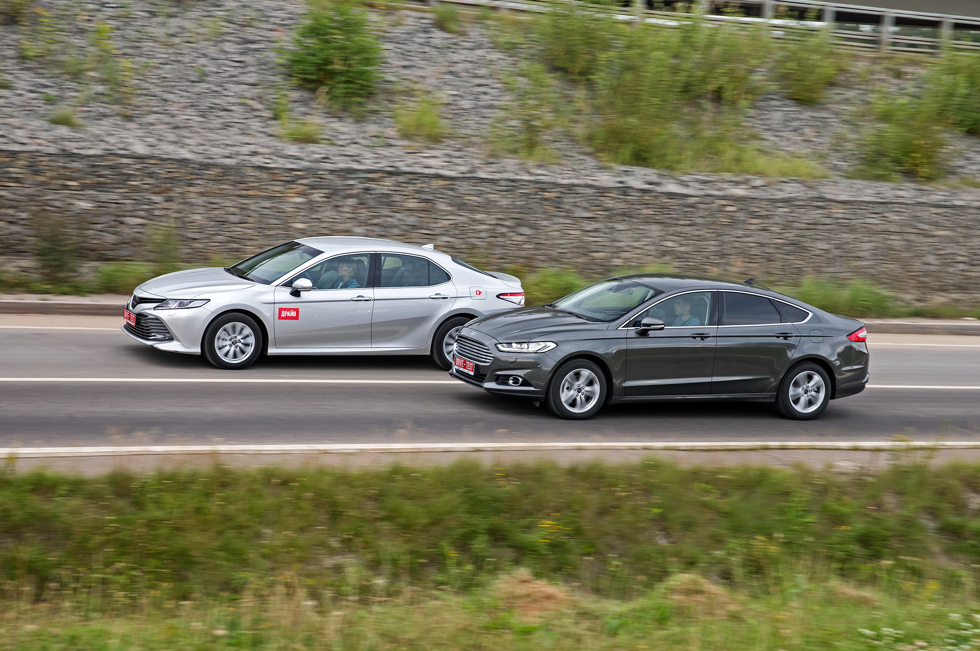 Toyota немного шумнее. Сразу после запуска отчётливо проявляется звук двигателя, сильнее вибрирующего на холостом ходу. Мотор явственнее слышно под нагрузкой, как и, например, дорогу при движении по мокрому асфальту. Зато подвеска не бухает на крупных неровностях, не говоря уже о том, что она лучше их демпфирует. Нет большой разницы, преодолеваешь ли лежачего полицейского на 20 км/ч или на 30. В Mondeo это принципиально. Camry идёт расслабленно, порой вразвалочку. Небольшое количество сопутствующих вибраций не вызывает чувства дряблости.
