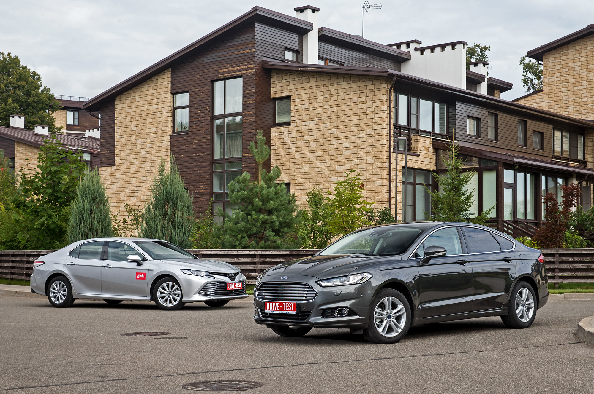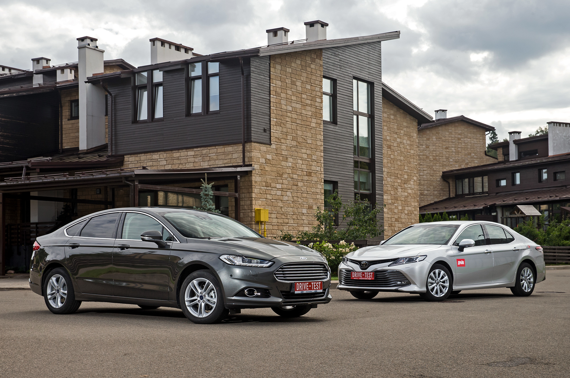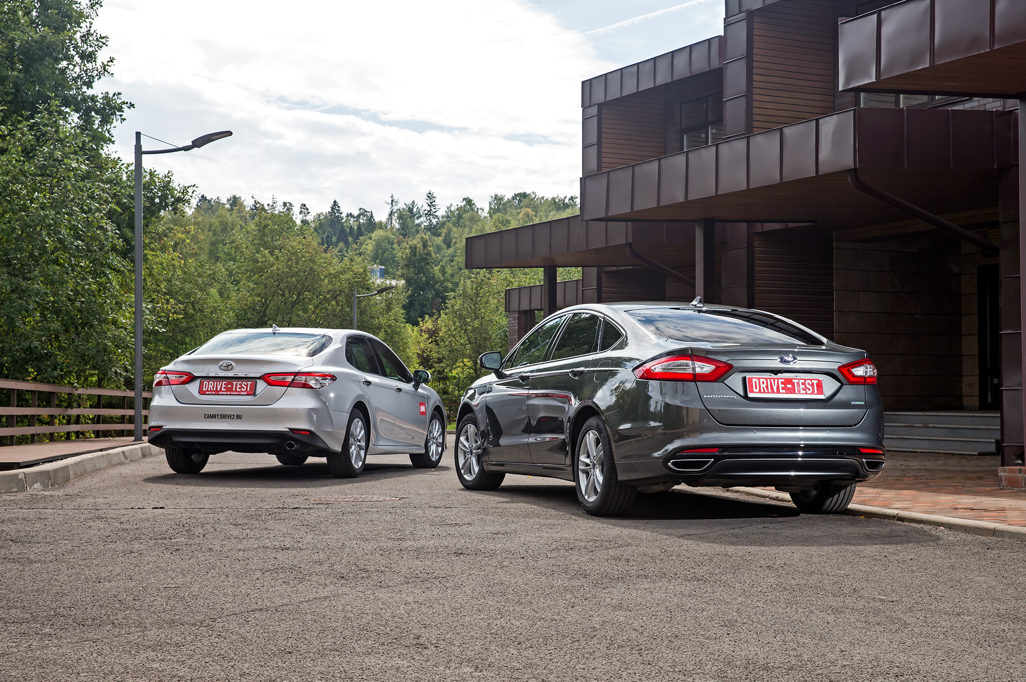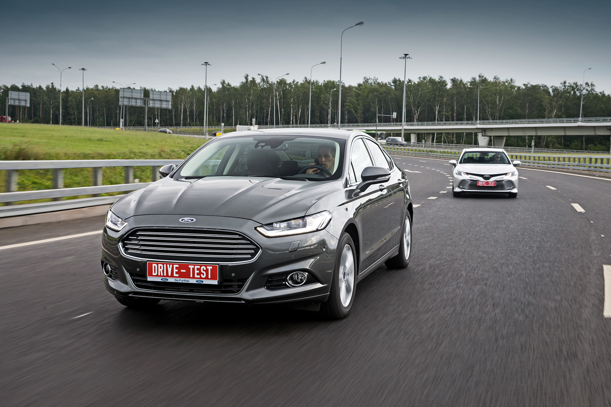 Toyota немного шумнее. Сразу после запуска отчётливо проявляется звук двигателя, сильнее вибрирующего на холостом ходу. Мотор явственнее слышно под нагрузкой, как и, например, дорогу при движении по мокрому асфальту. Зато подвеска не бухает на крупных неровностях, не говоря уже о том, что она лучше их демпфирует. Нет большой разницы, преодолеваешь ли лежачего полицейского на 20 км/ч или на 30. В Mondeo это принципиально. Camry идёт расслабленно, порой вразвалочку. Небольшое количество сопутствующих вибраций не вызывает чувства дряблости.