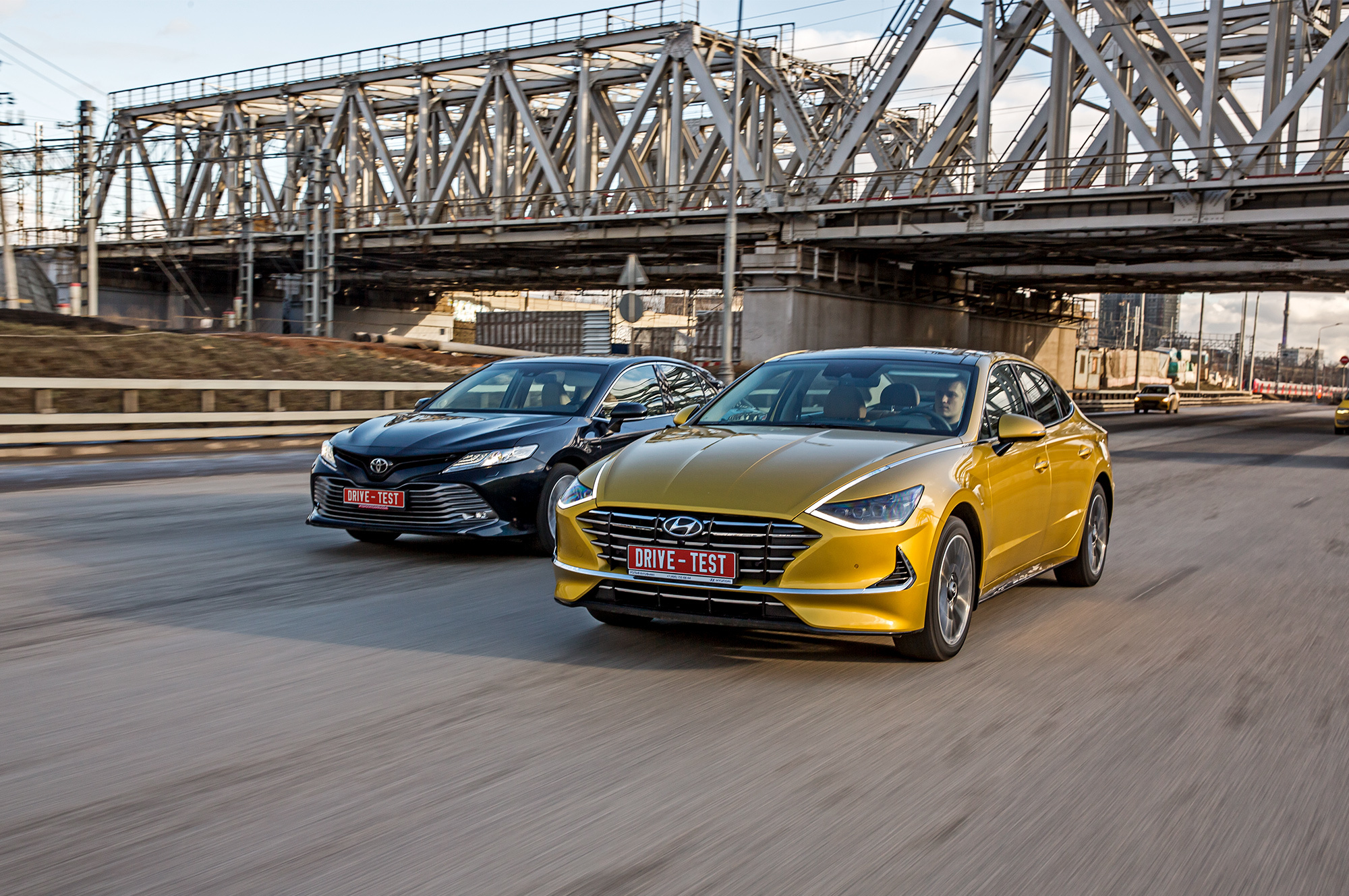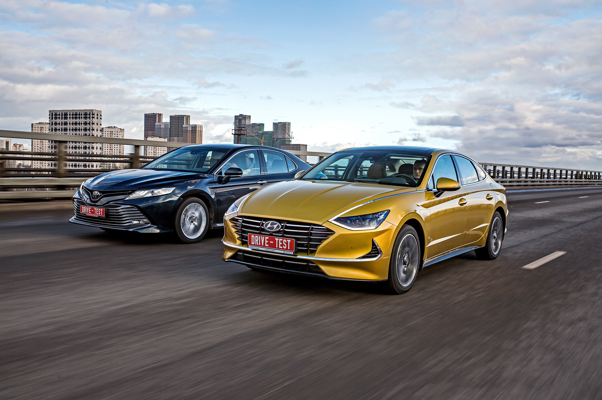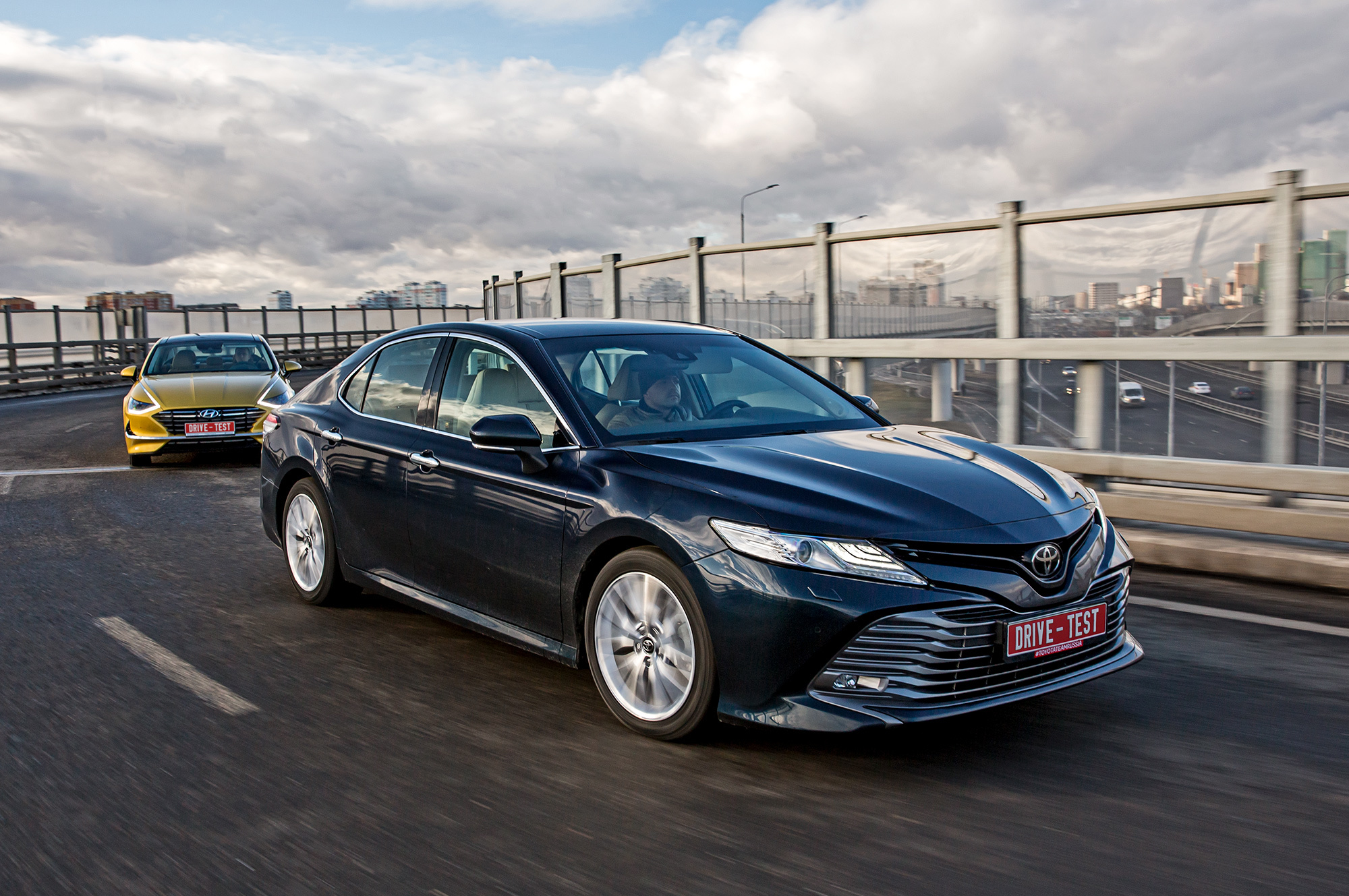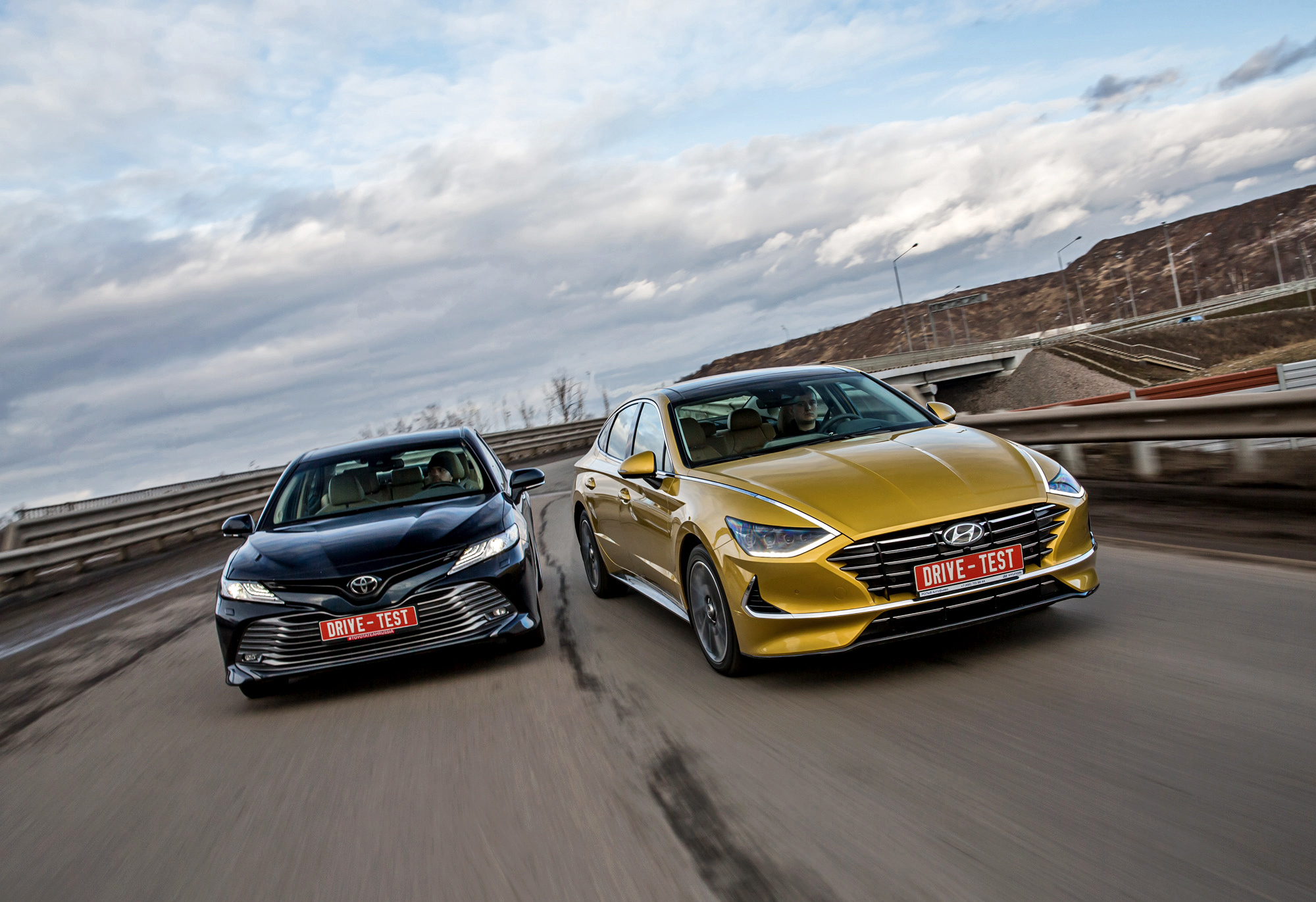 Sonata жёстче на любых типах неровностей. Скругляет, насколько возможно, тычки, но вибраций всё равно много что на полу, что на плотных сиденьях. Подрагивает на короткой волне, детализирует поперечные стыки. Сильно брыкается на «лежачих полицейских» уже при 20 км/ч, бухая подвеской на отбой. И не становится мягче с ростом скорости, в отличие от в целом более плавной и прощающей Тойоты. Специфический минус Camry — раскачку — отметят пассажиры, склонные к морской болезни.