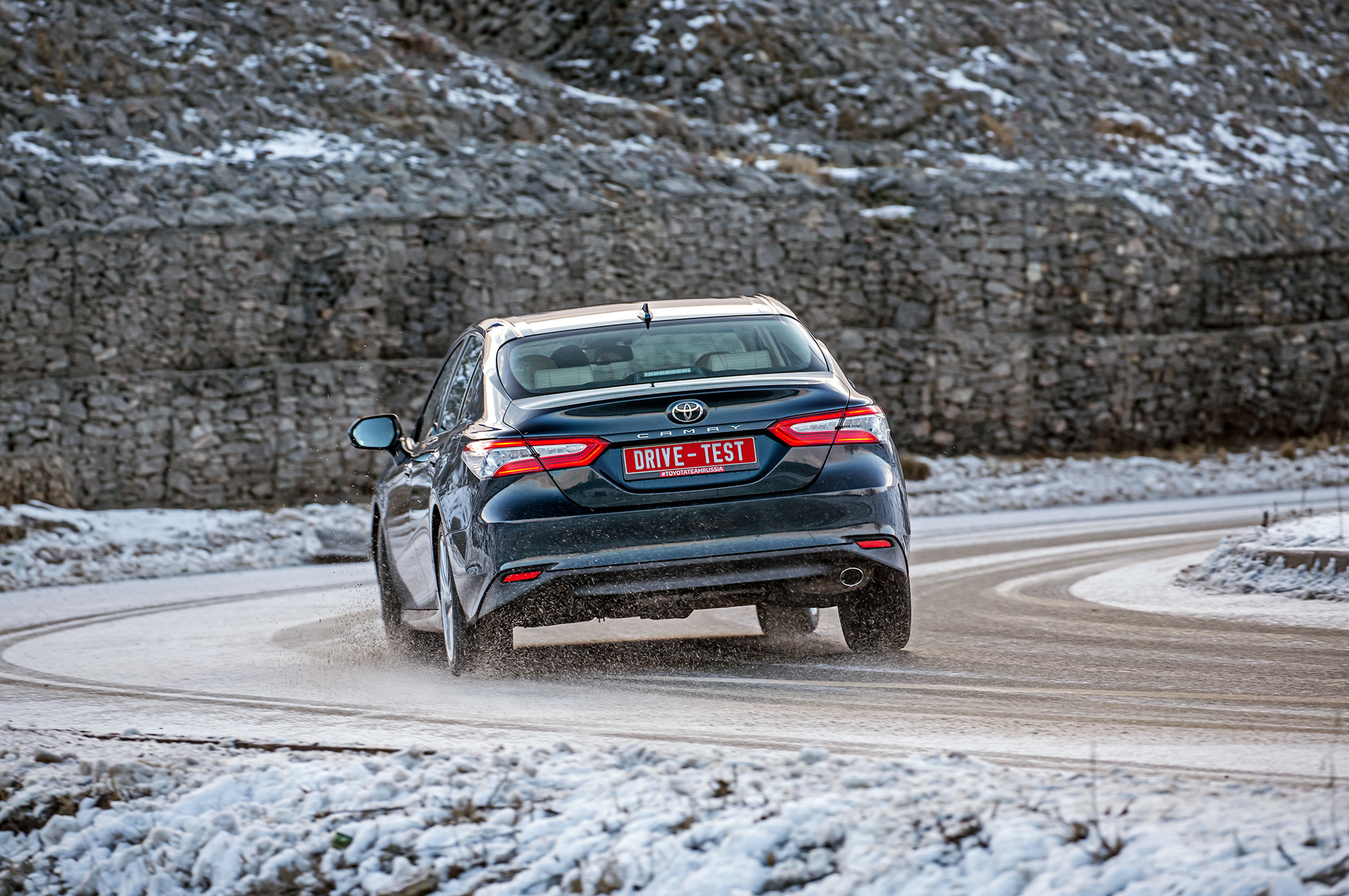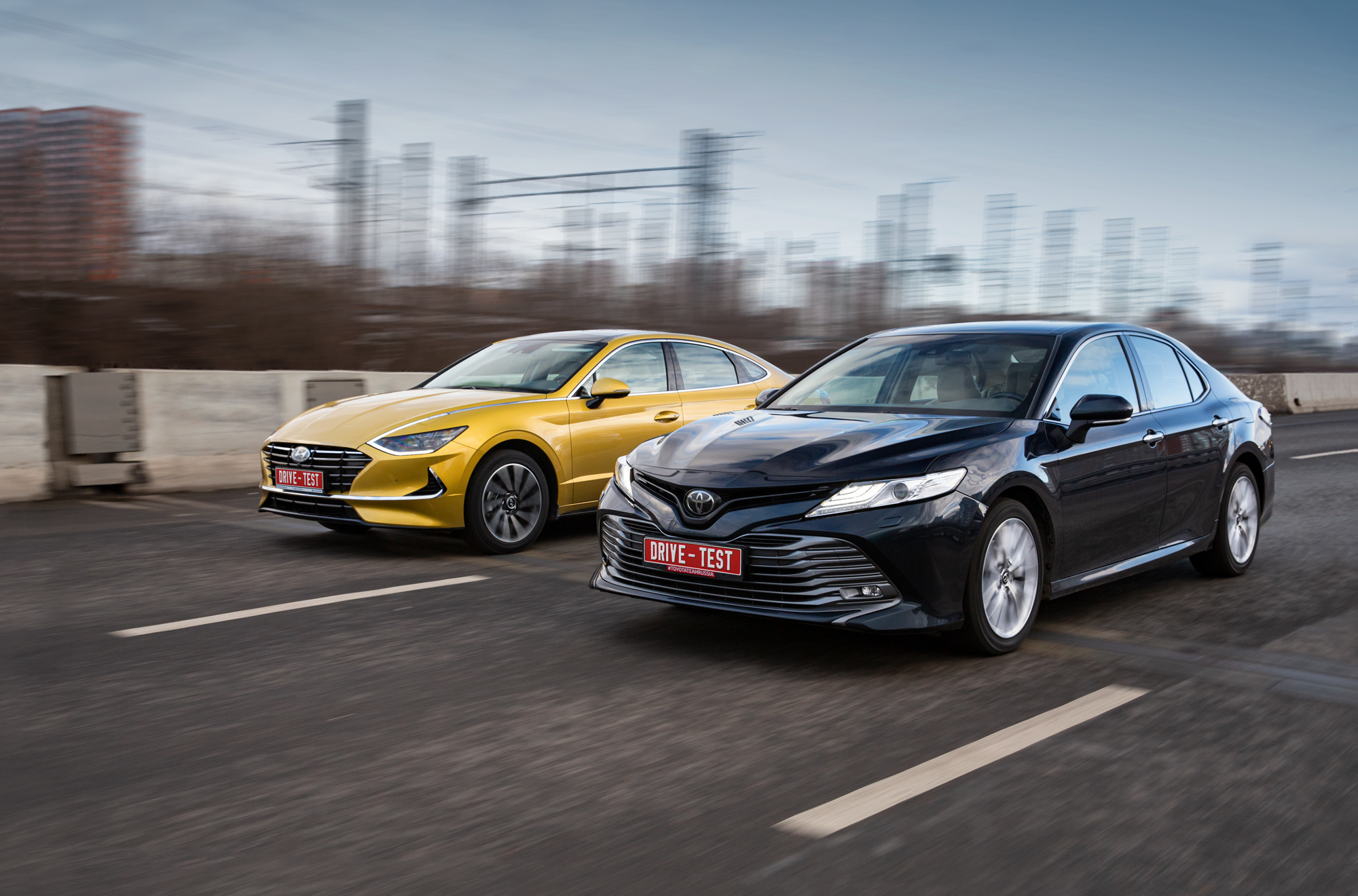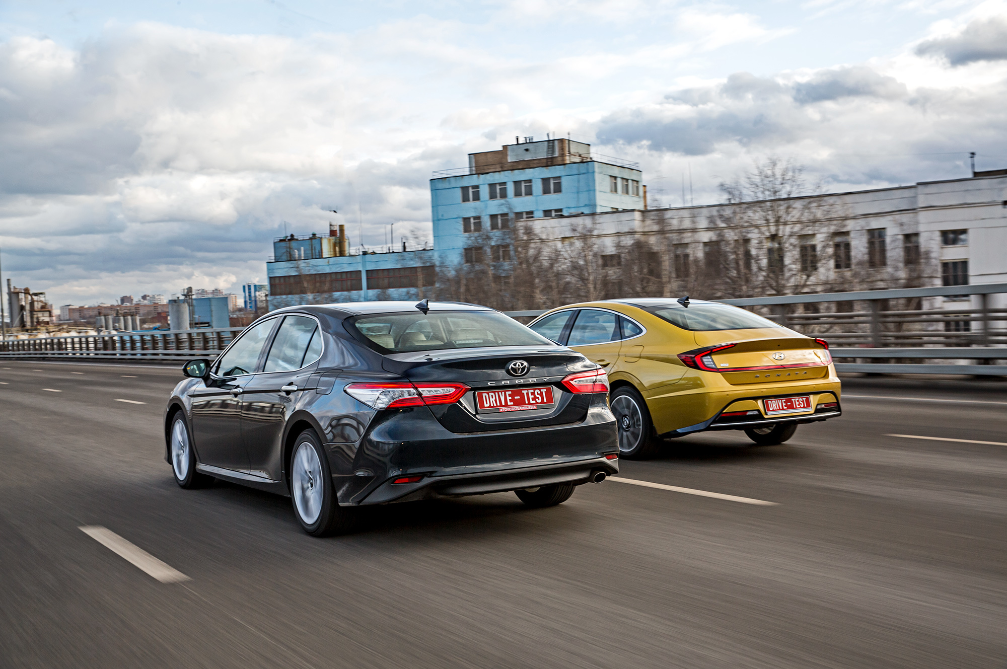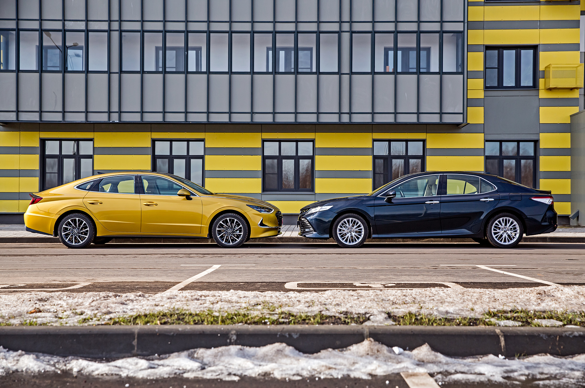 Наиболее востребованной Сонатой после смены поколений остаётся двухлитровая 150-сильная. Но представленная здесь топовая Sonata 2.5 Prestige (180 л.с., 232 Н•м, от 2 049 000 рублей) к началу весны оказалась второй по популярности во всей гамме. Только такие машины предоставляет пресс-парк Hyundai, что не оставляет нам свободы при выборе Тойоты — снова работаем с хорошо знакомой Camry 2.5 (181 л.с., 231 Н•м). Чтобы провести сравнение корректно, берём две одинаковые Тойоты, снимаем с одной нешипованные шины Yokohama Ice Guard IG60 235/45 R18 и переставляем на Сонату.