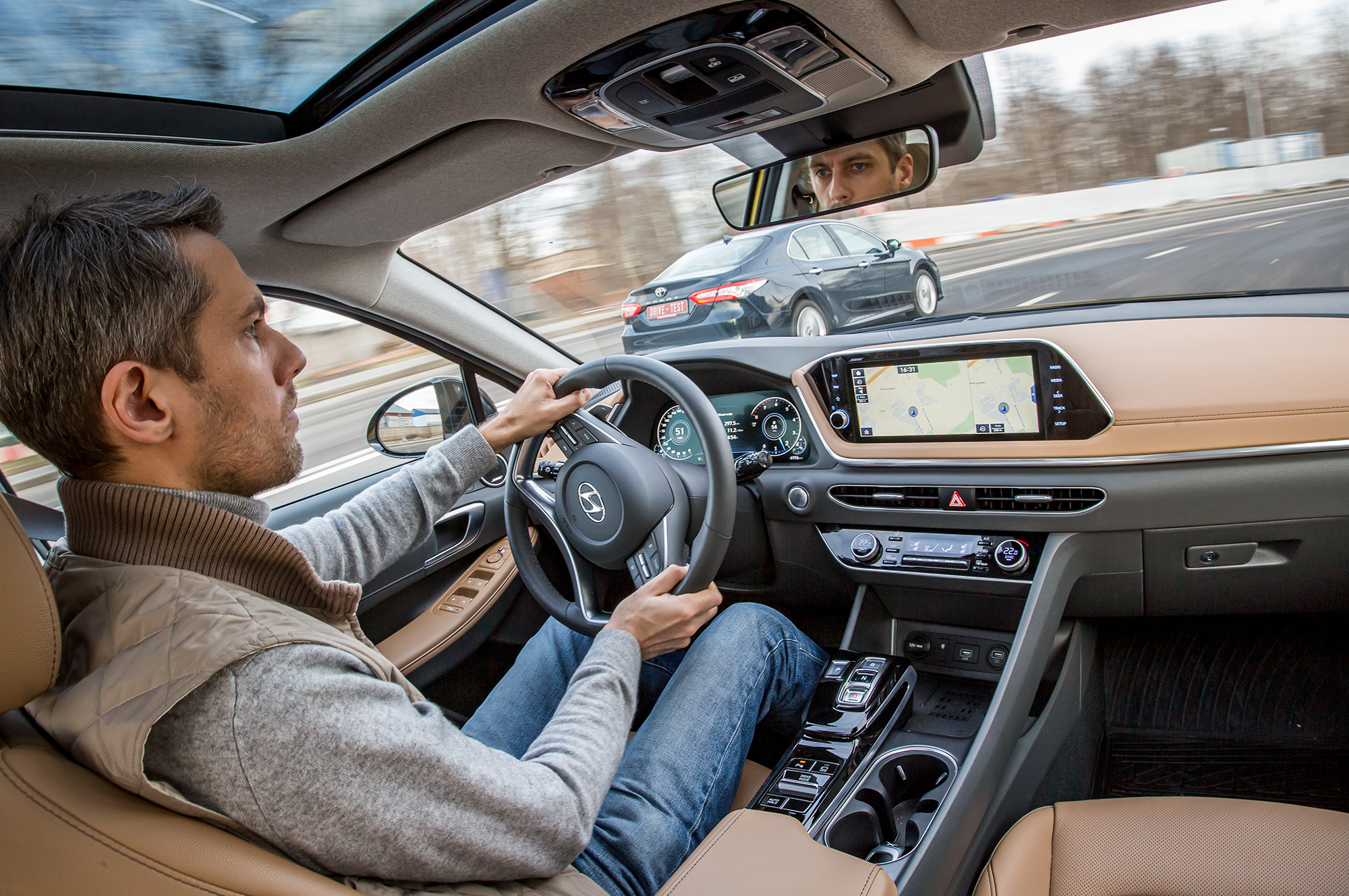 Впрочем, у каждой из участниц теста есть небьющиеся козыри. Стандартные для топовой Сонаты система кругового обзора, проектор показаний на лобовое стекло и опциональная панорамная крыша недоступны для Camry с мотором 2.5. Зато Toyota может предложить задним пассажирам электрорегулировку спинок, боковые подушки безопасности и отдельную климатическую зону с универсальным пультом управления в подлокотнике. Правда, всё это — ценой трансформации дивана.