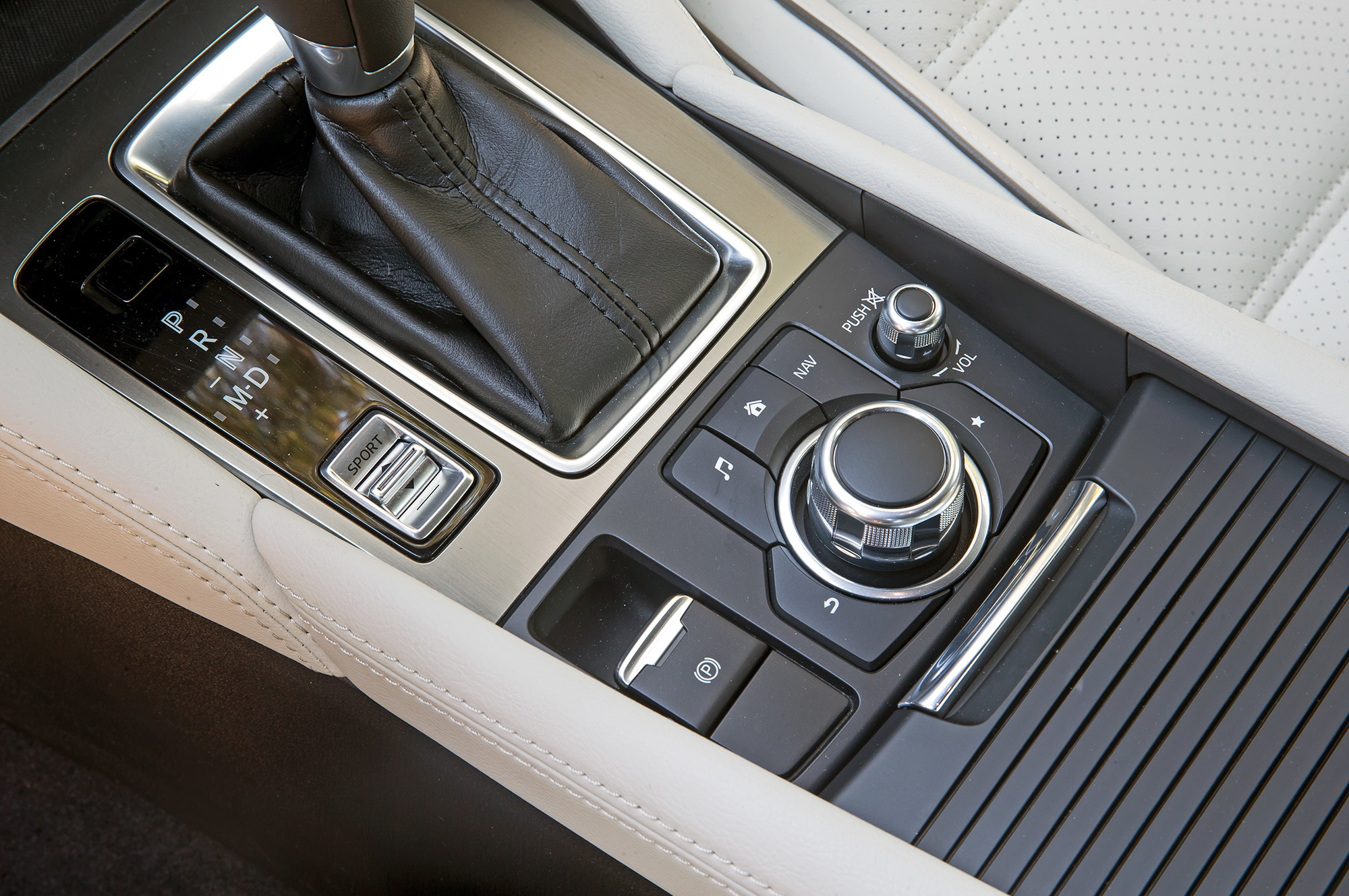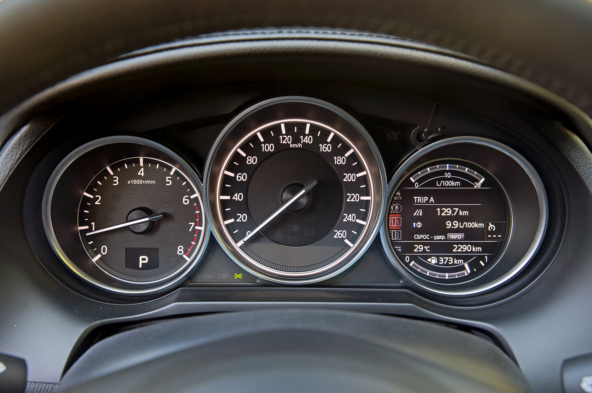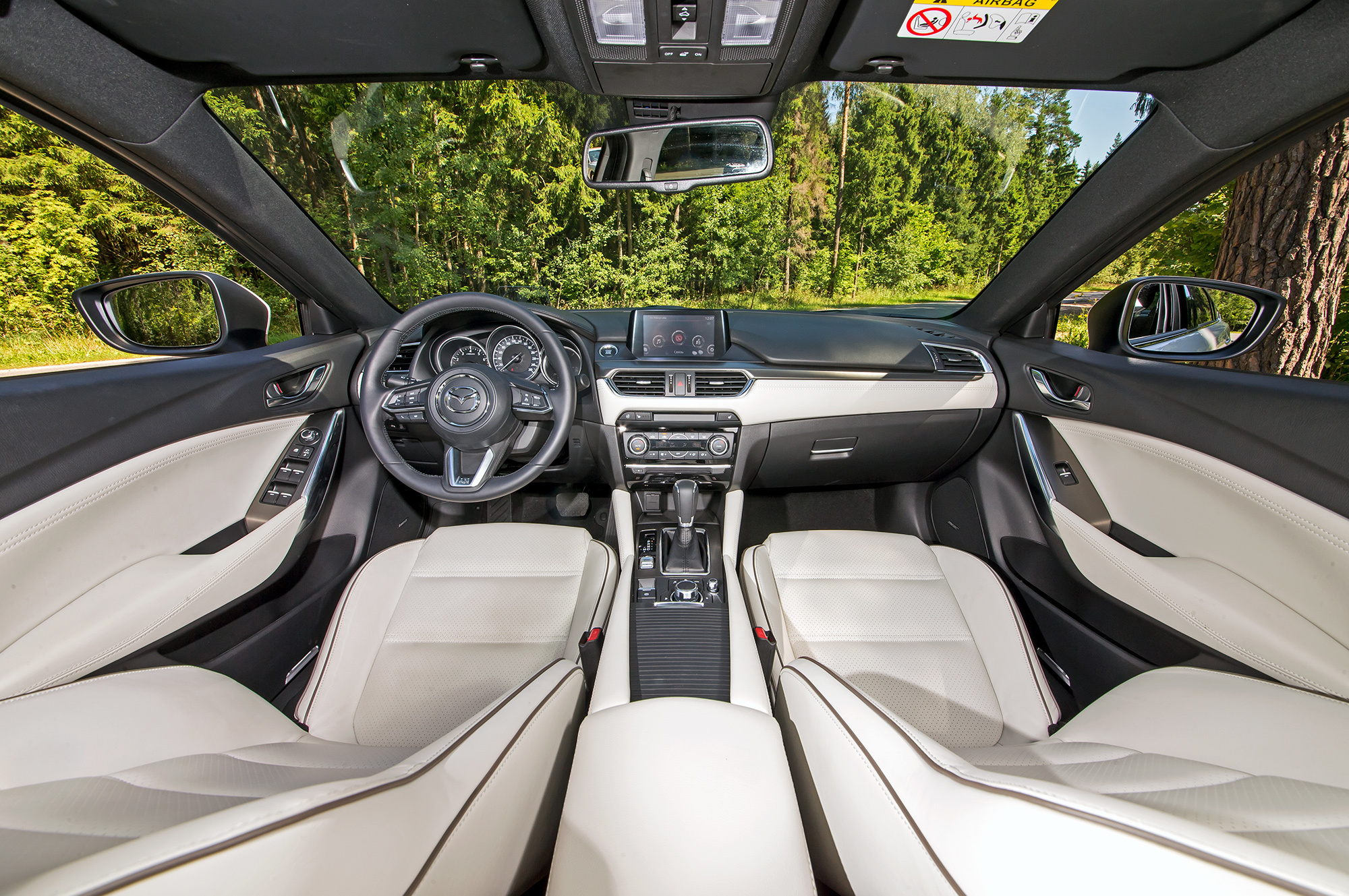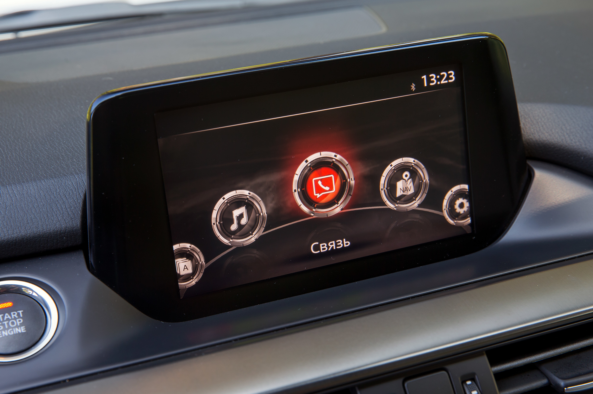 Это моя первая встреча с обновлённой в 2017 году Маздой, да ещё с мотором мощностью 192 л.с. Он гораздо лучше подходит «шестёрке», чем 150-сильный двухлитровый, хотя и не скажу, что разгон не требует усилий. Скайактивный двигатель по-прежнему раскрывается на высоких оборотах и довольно громок. Басовитей, чем в Тойоте, но, честно говоря, оба мотора не отличаются красотой голоса. Намного лучше, чем в Camry, настроен «автомат»: Mazda реагирует на подачу топлива быстро и линейно, понимает тонкую игру газом и в любой момент готова перейти на пониженную ступень. На «шестёрке» проще воспользоваться окном для обгона и вообще держать в городе собственный темп.