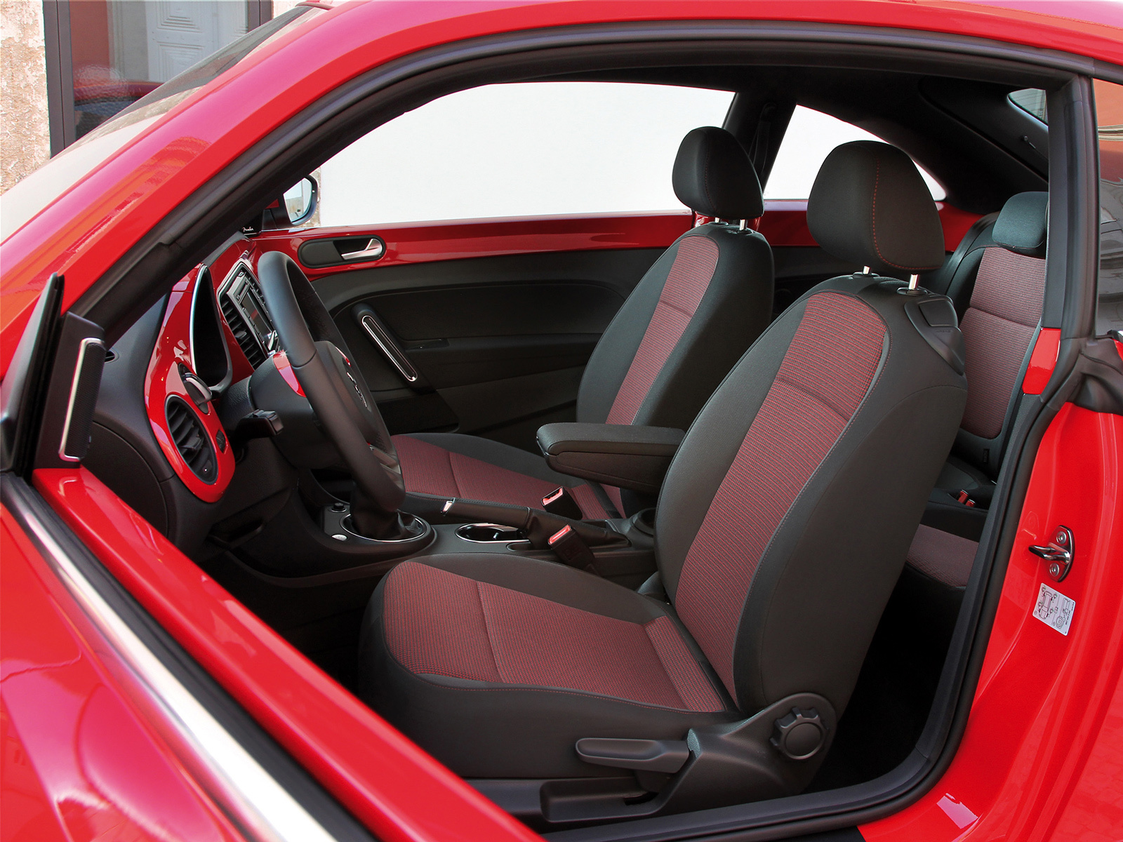 В самом доступном варианте (Beetle в Beetle) и самой дорогой спортивной версии вокруг тебя всё чёрное: либо просто так, либо «под углепластик». По-цветочному становится в модификации Design. Красный, жёлтый, голубой — в ассортименте 12 оттенков. Любители автомобильных вазочек получают яркости в виде «жестяных» накладок в цвет кузова (привет, Fiat 500) не только на переднюю панель, но и на руль, специально для Жука созданный.