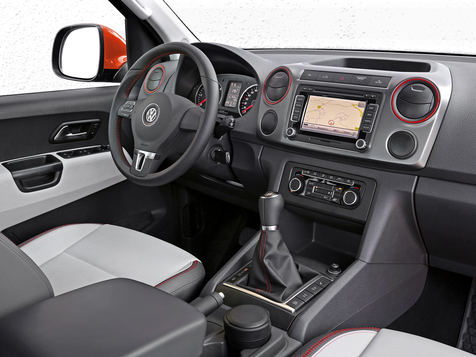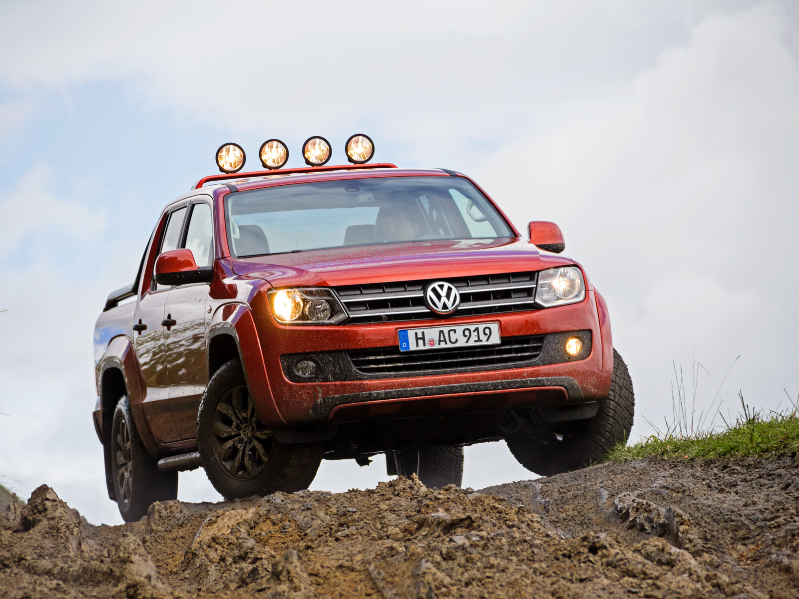 Увы, балочная система освещения, работающая при включении дальнего света, крышка на кузов и защитные дуги — опции за отдельную плату. Тогда что получает покупатель Амарока в версии Canyon? Пижонский салон! Сквозь нарочито грубую кожу сидений протянут оранжевый лейтмотив. Он тянется далее по ремням безопасности и расползается кругами по передней панели. Нарядно, но это ли нужно владельцу пикапа? А вот за «зубастые» шины спасибо! Очень скоро стало понятно, что именно они определяют уровень проходимости немецкого пикапа.