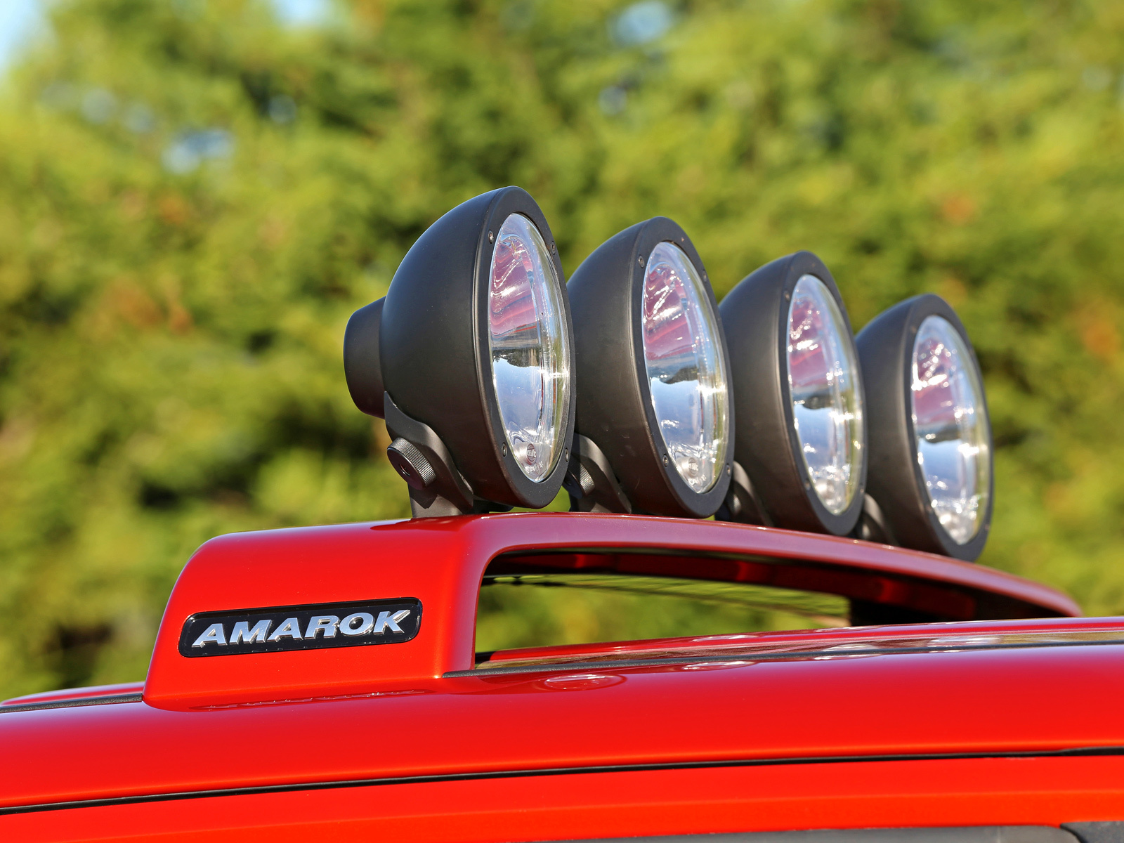 Отыграться у моноприводного «собрата» Cross Caddy 4Motion мог бы вне асфальта, но таких дорог в маршрут заложено не было. Зато на съезде с шоссе нас ждал Volkswagen Amarok с приставкой Canyon. Удачное название! Ковбойский имидж подчёркнут специальной окраской Copper Orange и чёрной окантовкой колёсных арок. На ногах пикапа внедорожная обувка: шины 245/70 с развитыми грунтозацепами, натянутые на 17-дюймовые диски Roca оригинального дизайна. На крыше четырёхствольная «люстра». Грузовой отсек прикрывает сдвижной хардтоп.