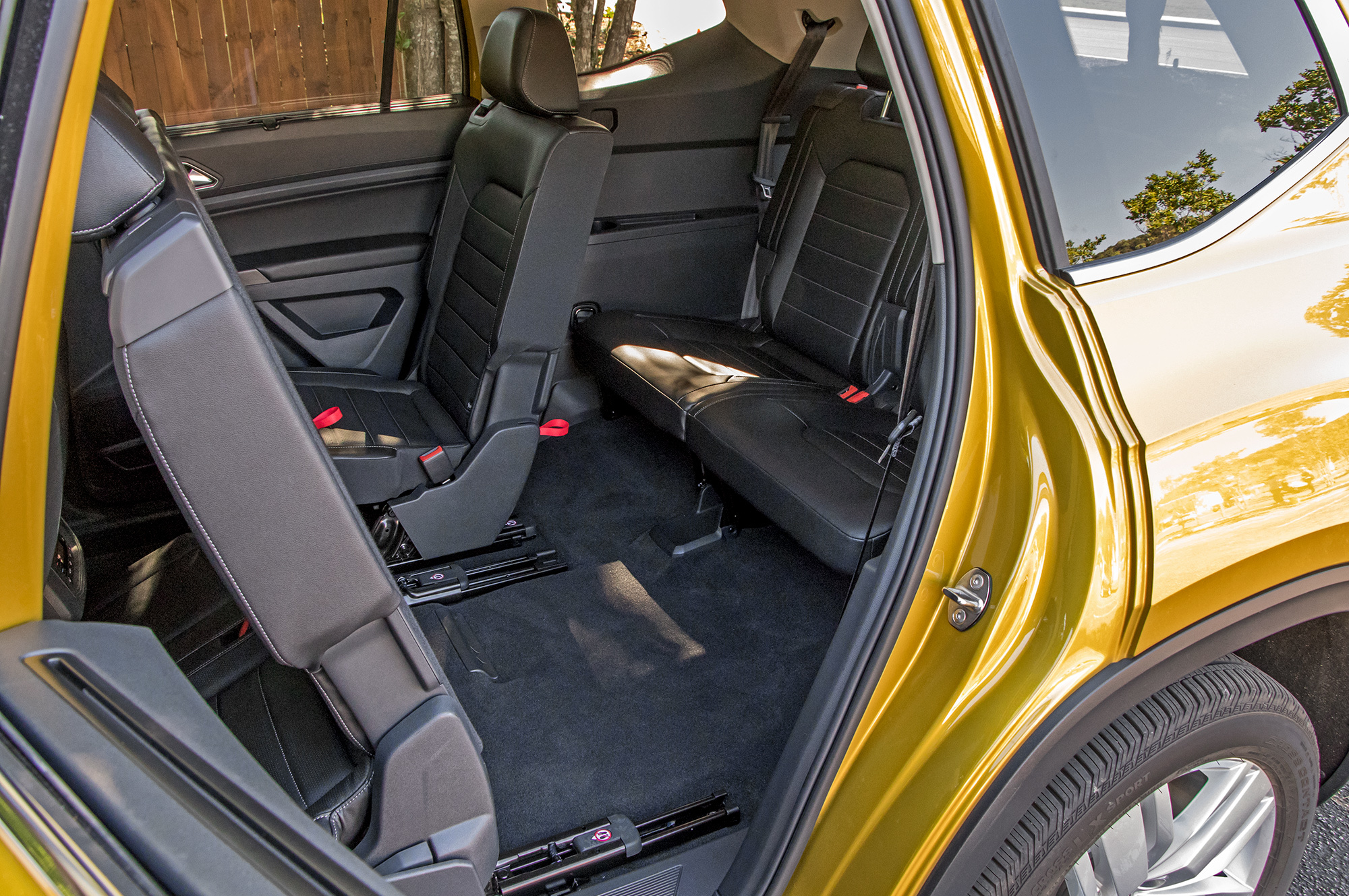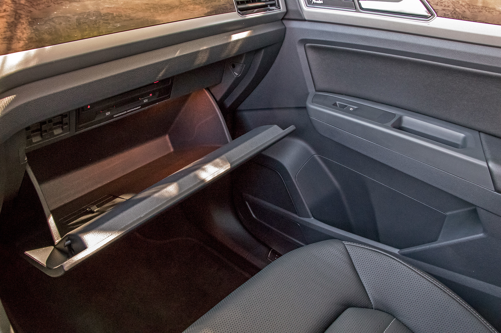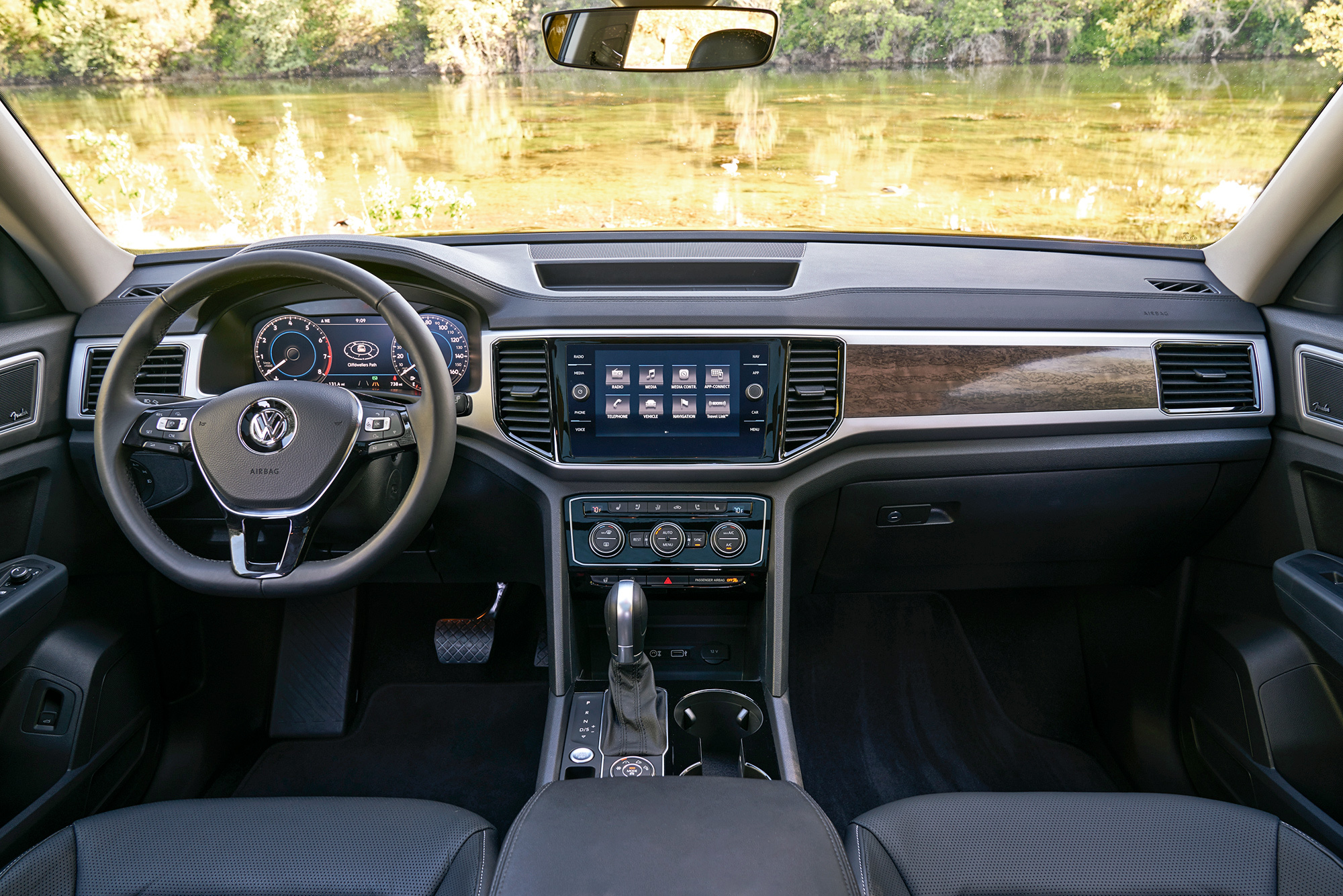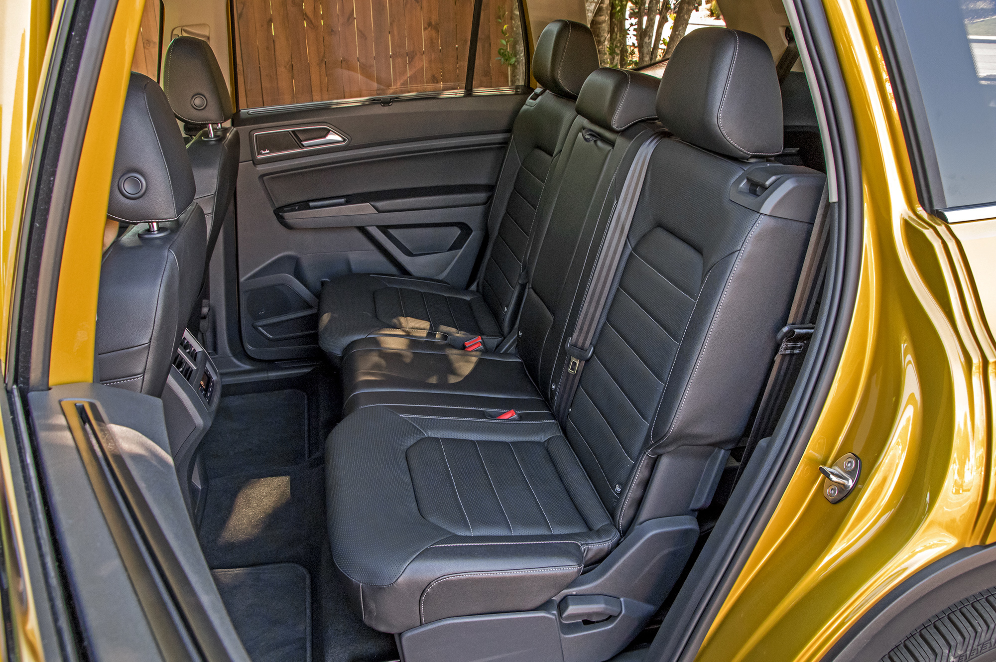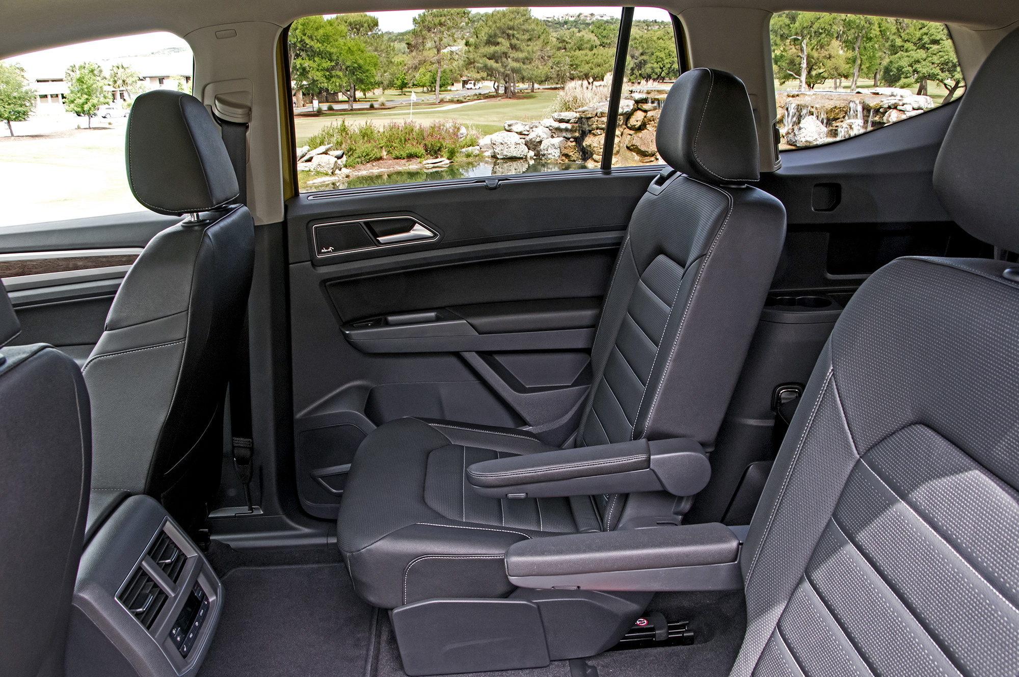Кубические футы внутреннего объёма, дюжина подстаканников и подбутыльников, отличная подгонка всего и вся… Главное ― не присматриваться. Американский Atlas/Teramont не просто так дешевле и легче всемирного внедорожника Touareg. Местами взгляд цепляет неприкрытый пластиком металл, а мягки только нерегулируемые подлокотники да верхушки передней панели и карт передних дверей. Центральные воздушные дефлекторы не закрываются, бардачок гол как сокол и не охлаждается, задние пассажиры лишены мониторов ― хотя за шесть сотен баксов диван можно заменить парой «командирских» кресел с подлокотниками. Аккуратно, но для такого бегемота ― бедно.