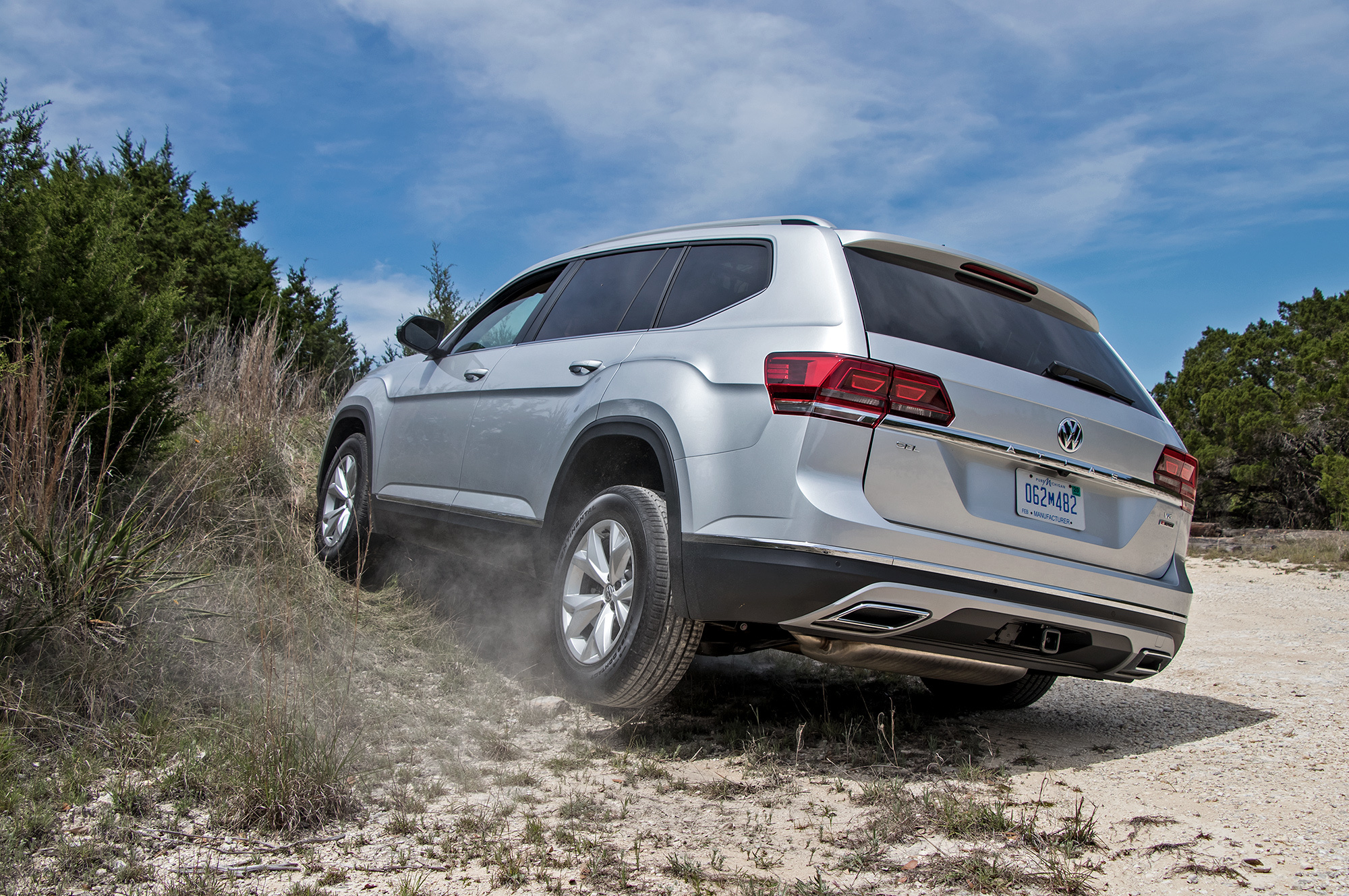 Гидромеханика помогает и на бездорожье, пусть для буераков земно-горный Teramont не особо и заточен. Преимущества двадцатисантиметрового клиренса отчасти нивелируются длинной базой, а многодисковая муфта подключения задней оси вручную не блокируется. Зато электроника настроена великолепно: на косогор Volkswagen залезает, лишь на секунду отвлёкшись на диагональное вывешивание. В режиме Offroad, который включается маховичком на центральной консоли, он такого препятствия будто не замечает! Правда, в техасских прериях я и эту-то горку еле нашёл ― что будет у нас?