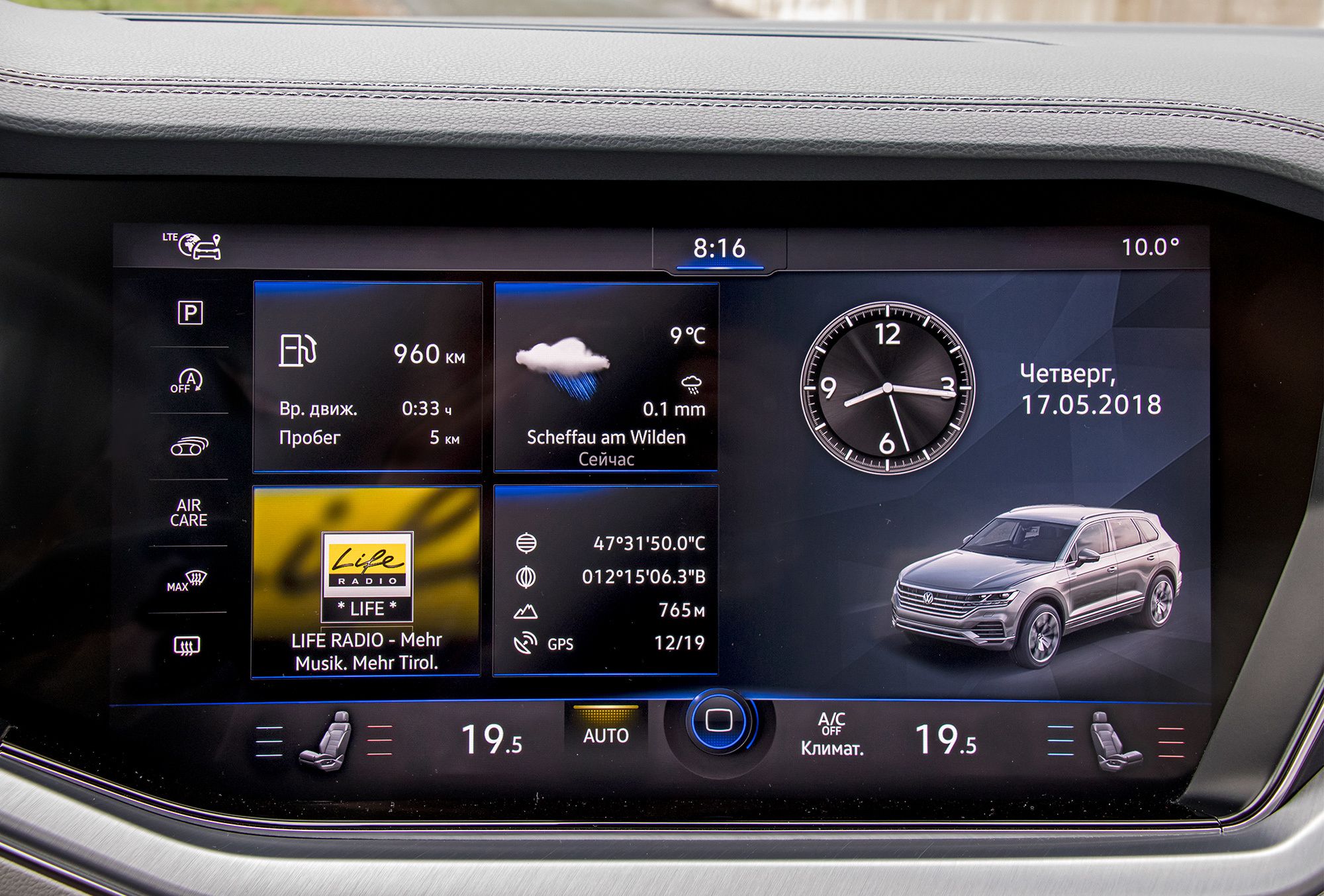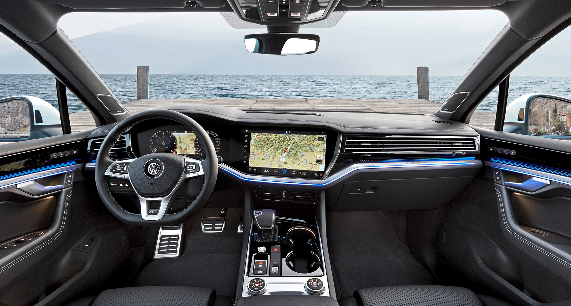 С обновлением он подзадержался: предыдущие два поколения, по сути, использовали неизменную с 2002 года платформу. Все друзья-соперники по новой архитектуре MLB Evo, включая Audi Q7 и Porsche Cayenne, уже продаются. Все технологические новинки по ним и известны: наполовину алюминиевый кузов, опционная развитая мехатроника шасси ― активные стабилизаторы поперечной устойчивости, заднее рулевое управление, пневмоподвеска (но с двухкамерными баллонами против трёхкамерных у Porsche). Изюминка Туарега — космический интерьер. Особенно если владелец доплатил за огромный 15-дюймовый экран, удачно вписанный в панель вместе с электронным же щитком приборов.
