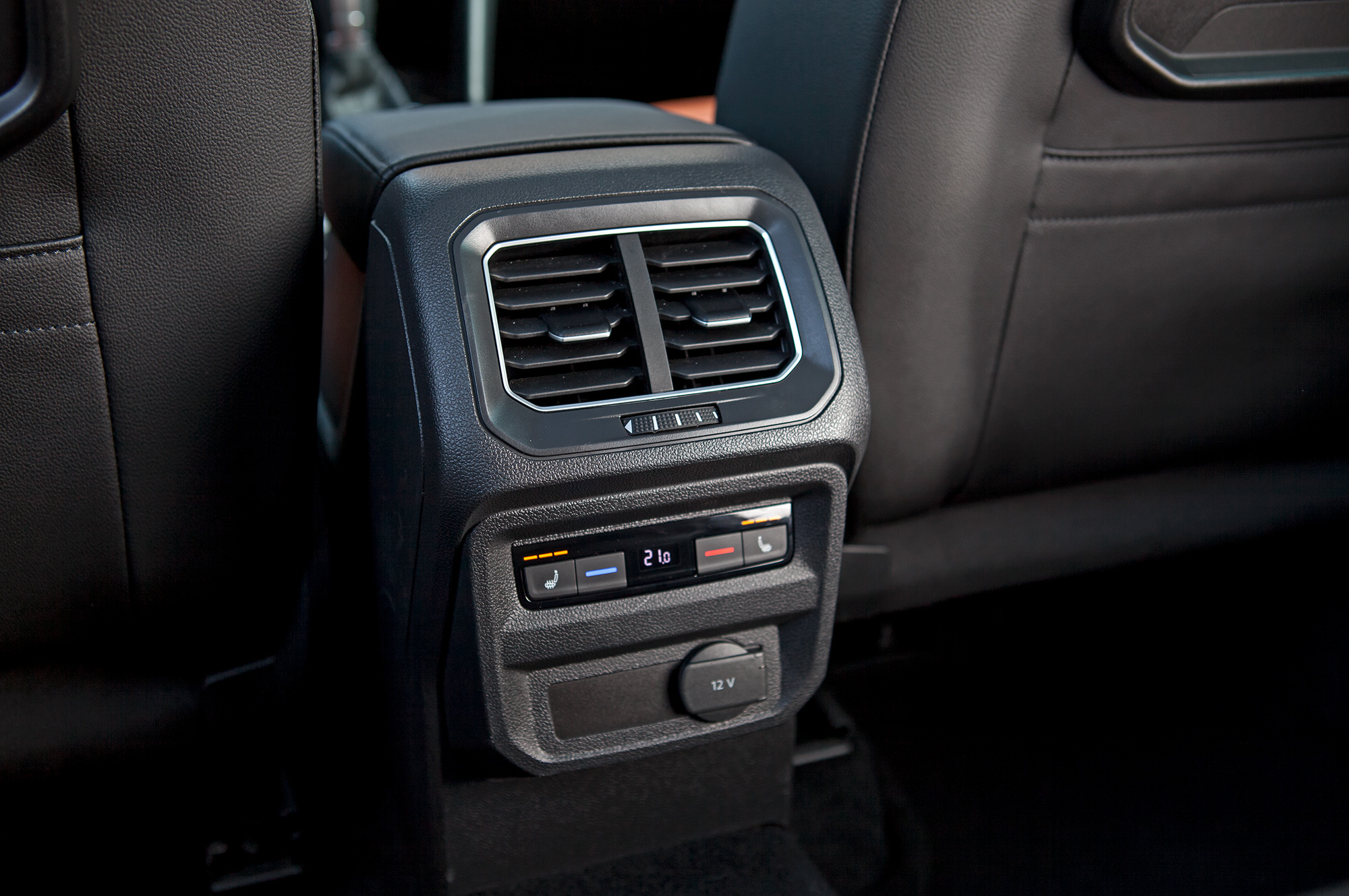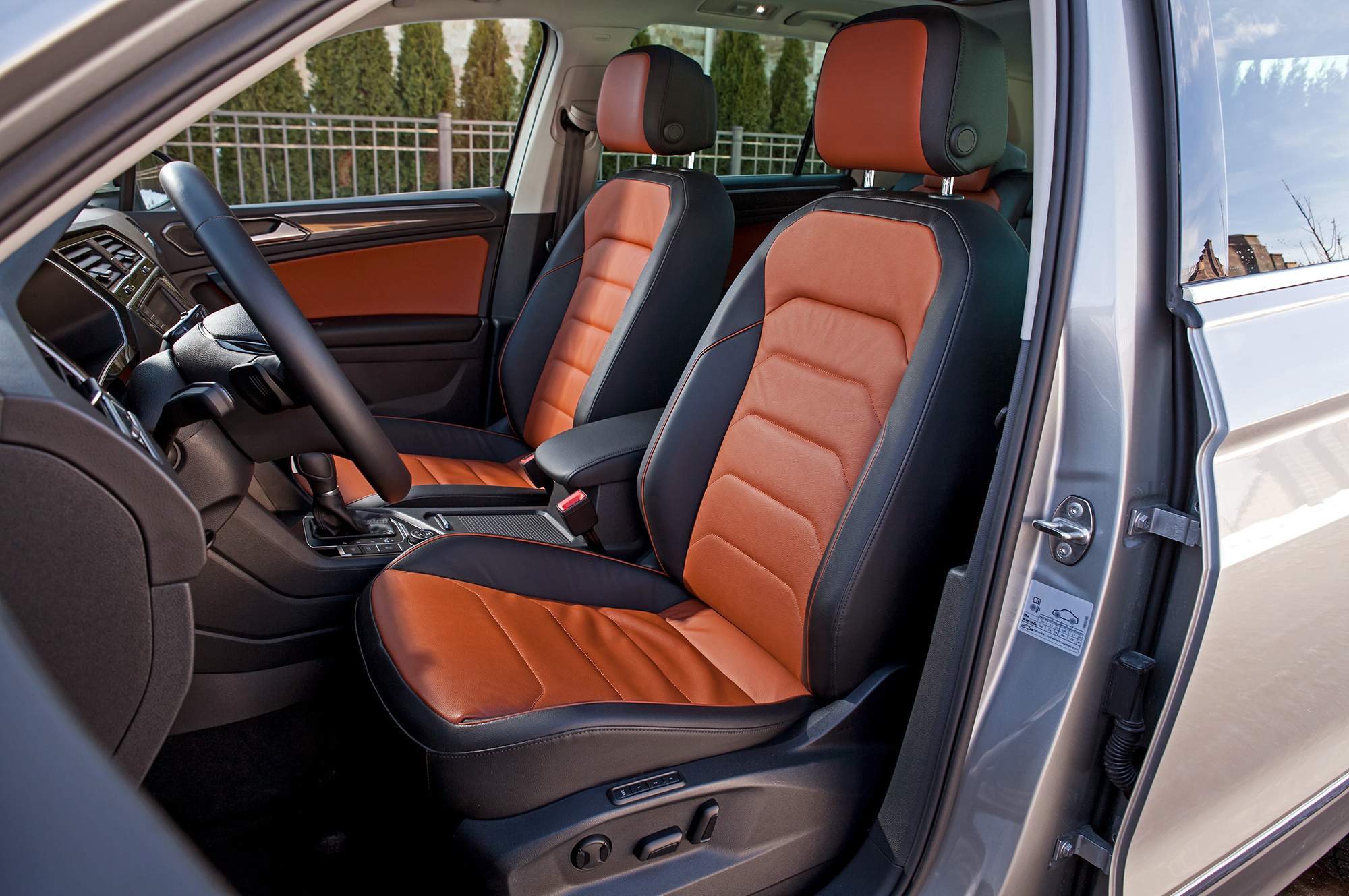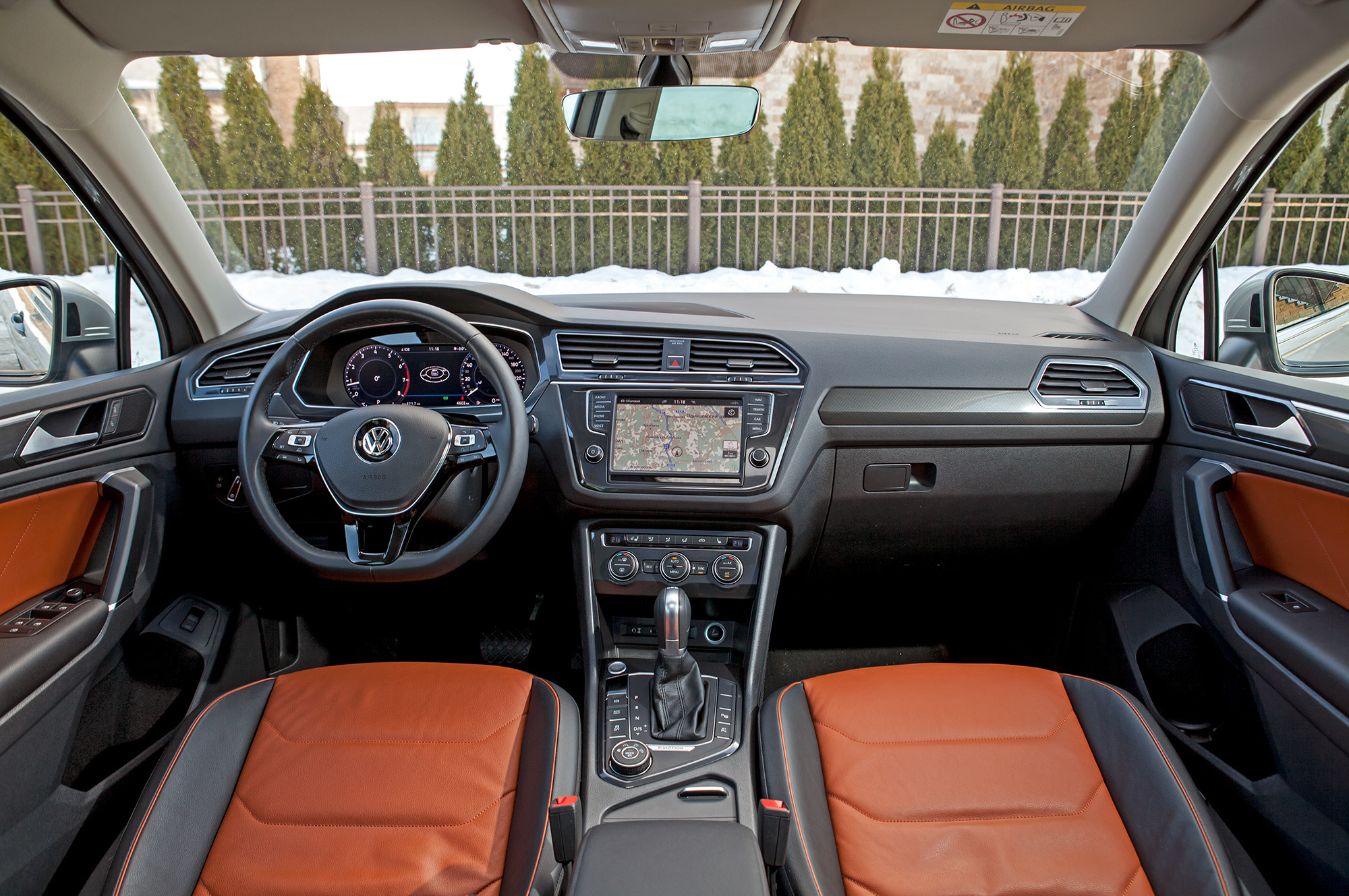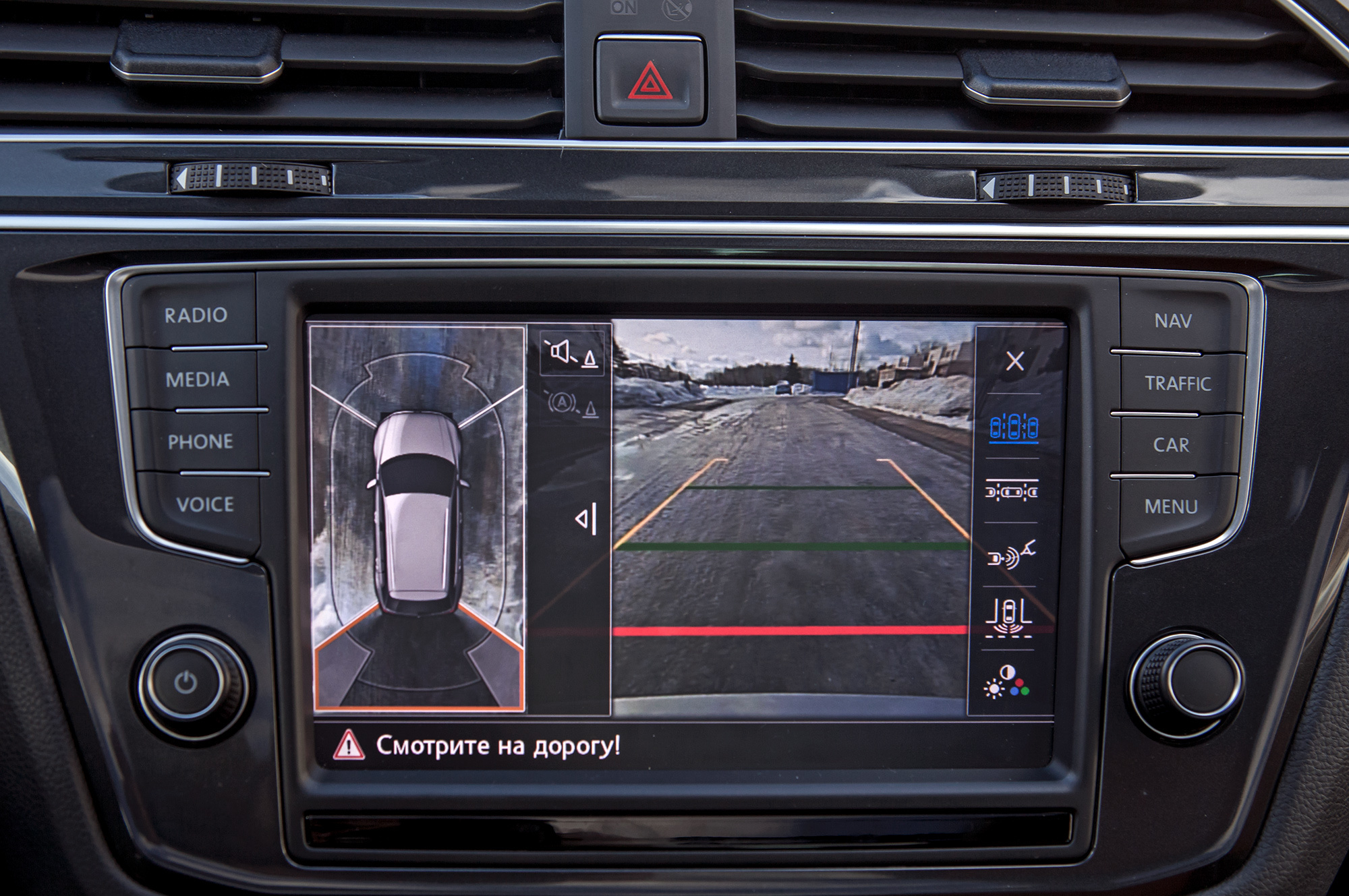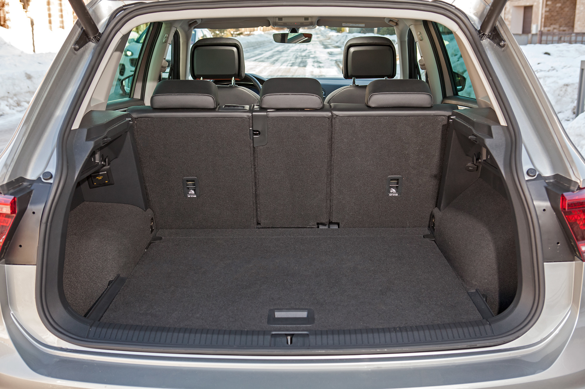 Внутрь не садишься — забираешься, перешагивая высокий порог. Просторнее только RAV4, эргономика идеальна. Обзорность хороша, почти как у той же Тойоты, за исключением небольших зеркал. Отделочные материалы даже базового Тигуана лучшие, что уж говорить про наш топовый. Пластик мягок, дверные карманы ворсисты. Только здесь на втором ряду предусмотрены и своя зона климат-контроля, и продольная регулировка дивана, и изменяемый угол спинки. Правое переднее сиденье складывается для перевозки длинномеров, а в багажнике есть розетка на 220 B и фонарик.