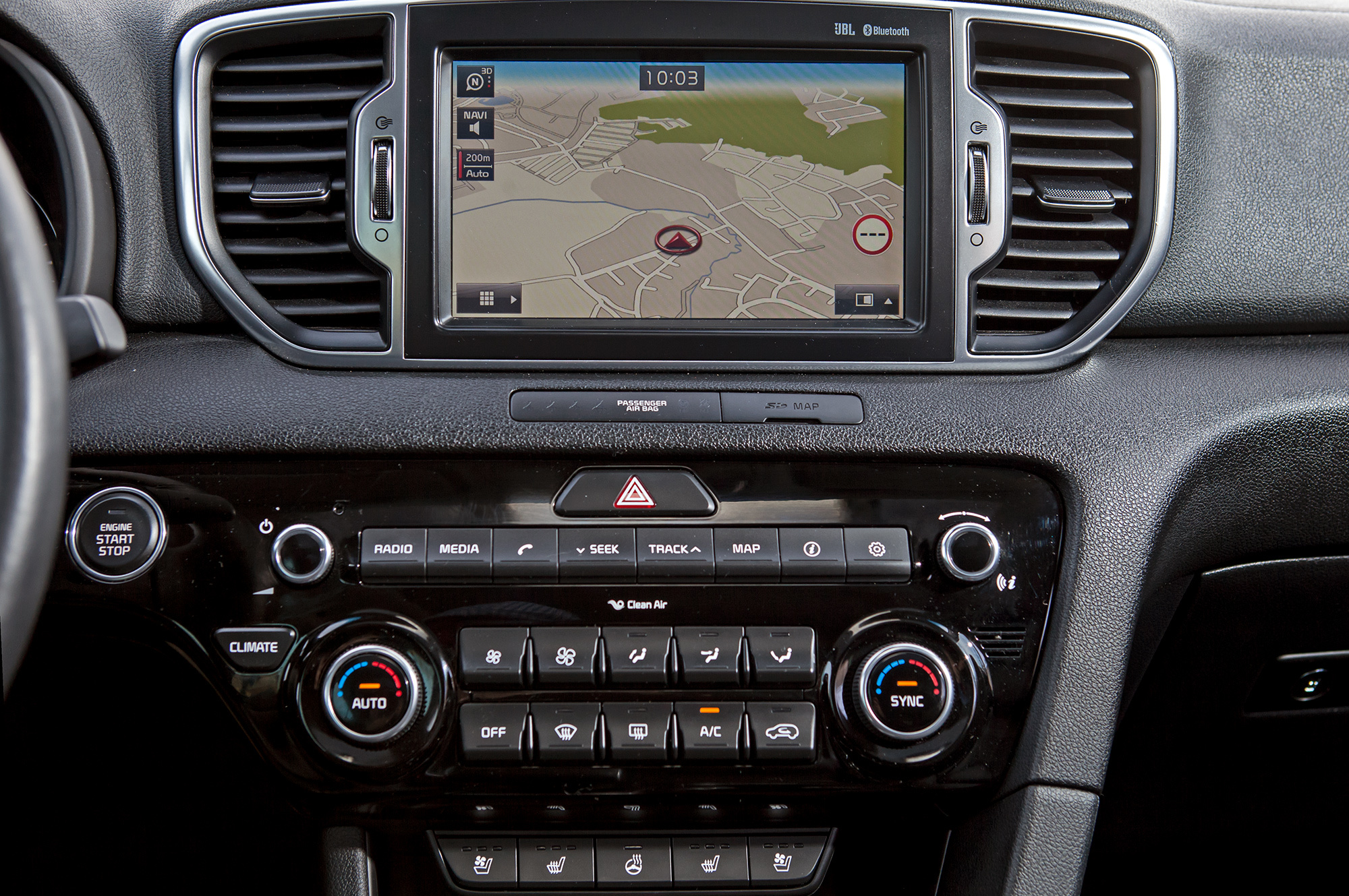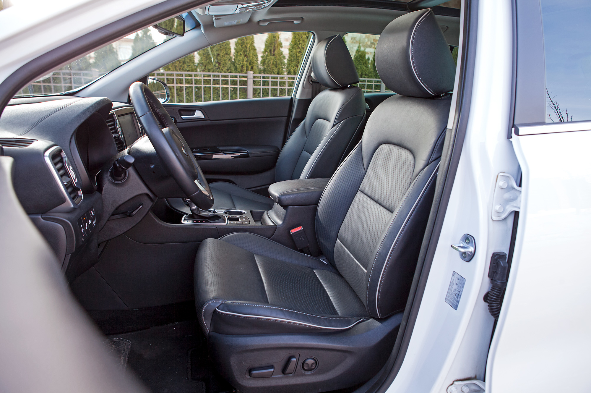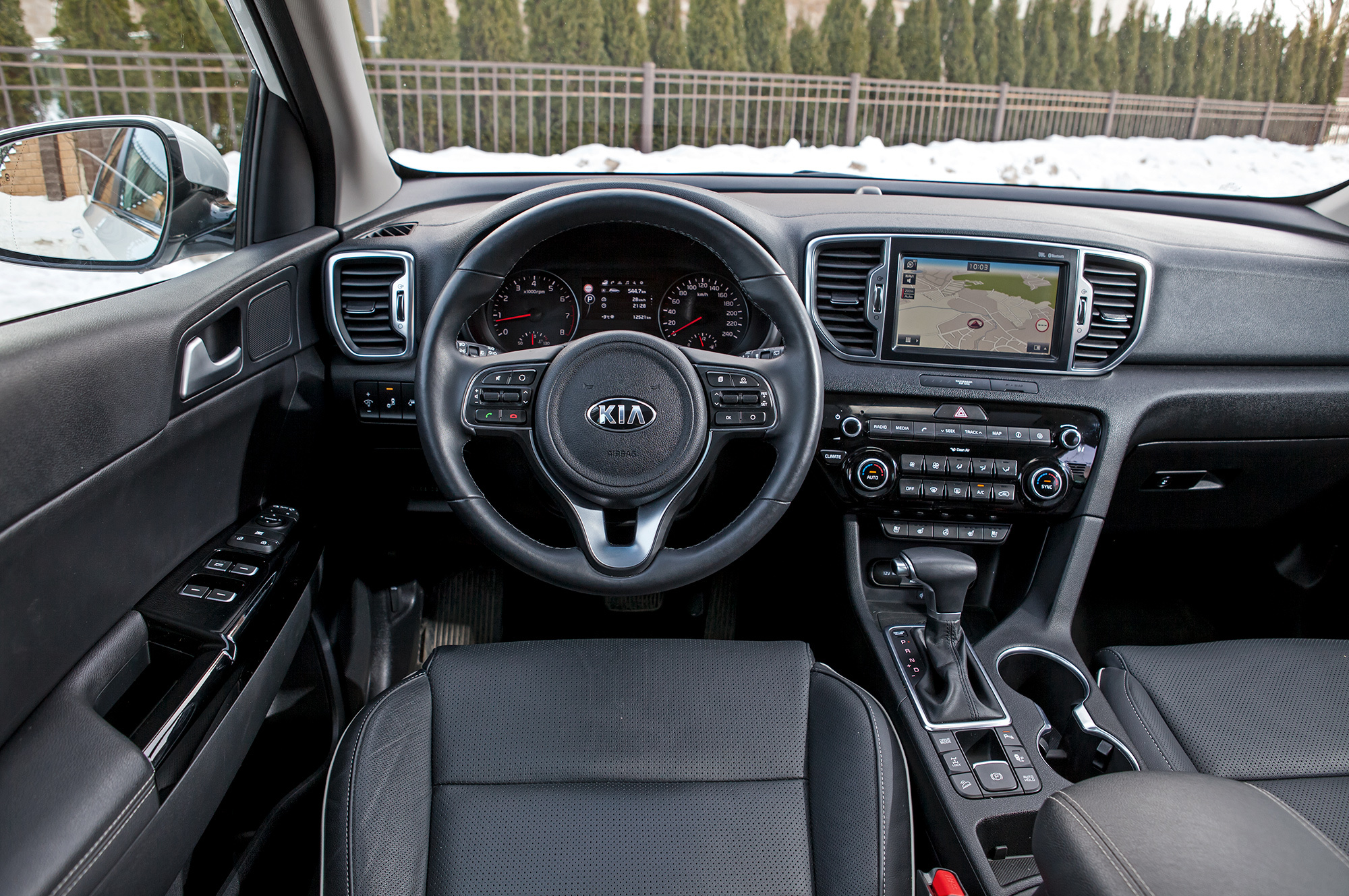 Kia Sportage продуман. Приборы ясны, клавиши логично сгруппированы, понятен интерфейс борткомпьютера и мультимедийной системы. По организации интерьера и второстепенных органов управления «корейцу» не стыдно и перед Тигуаном. Однако сиденье — самое мягкое и скользкое, а обзорность лишь чуть лучше, чем в Куге, при этом сильнее страдает из-за быстро пачкающихся боковых стёкол.