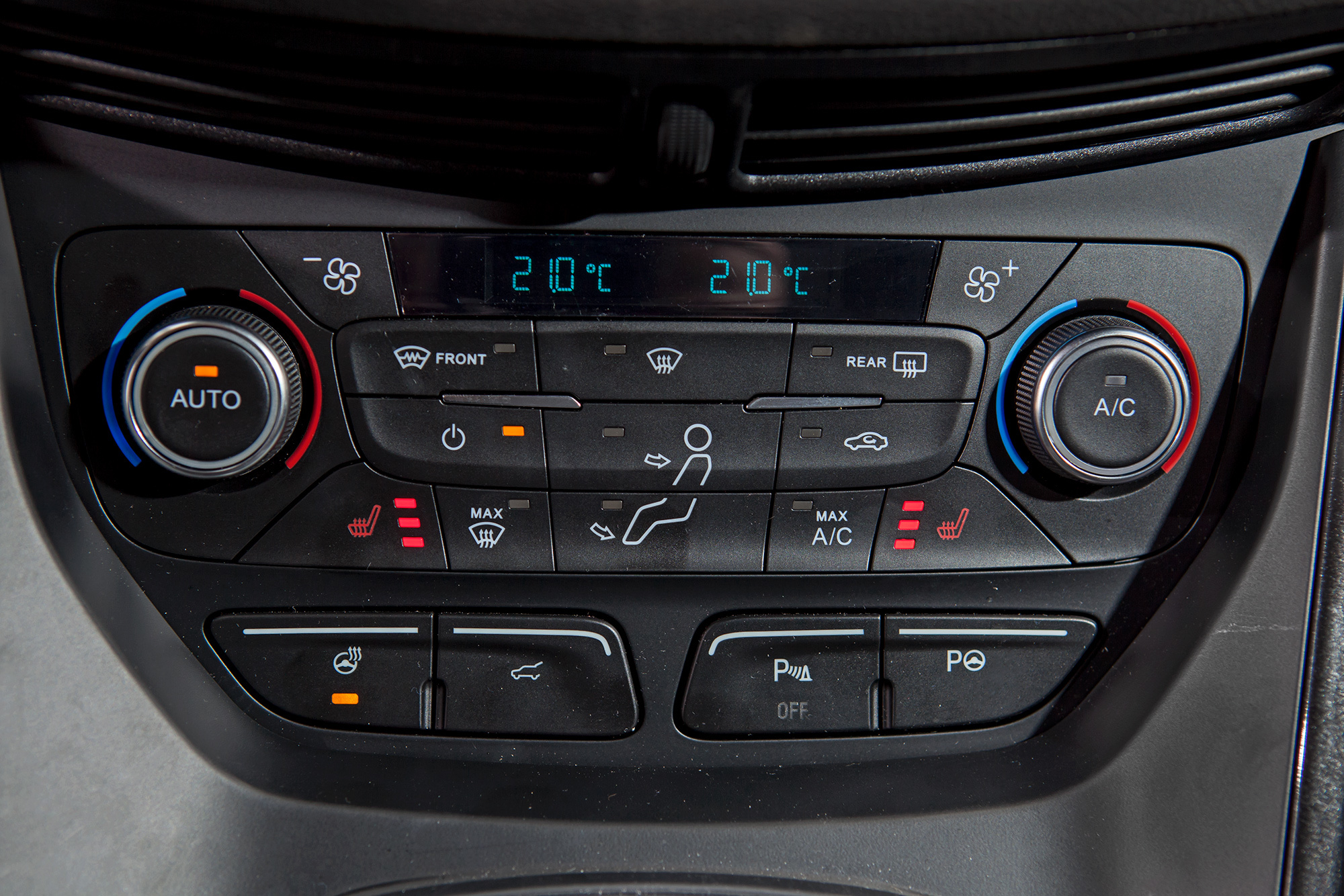 В Куге сидишь выше, но обзорность хуже из-за широченных оснований передних стоек. Выпуклая передняя панель с хитрыми воздуховодами скрадывает ощущение простора. Кресло удобно, хотя крупным водителям не понравится узкая подушка. Вкусно щёлкает «поворотник», приятно нажимаются клавиши и рычажки, но к эргономике есть вопросы. Велик перепад между педалями, рычаг «автомата» в положении «P» перекрывает блок климата, нужно тянуться к тачскрину продвинутой мультимедийной системы SYNC 3. Да и большой семье Kuga не подходит: сзади самый скромный запас места в ногах и не бывает подогрева. Багажный отсек тоже меньше, чем у остальных.