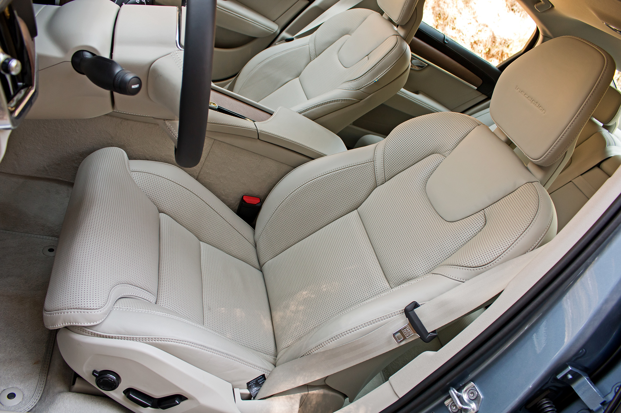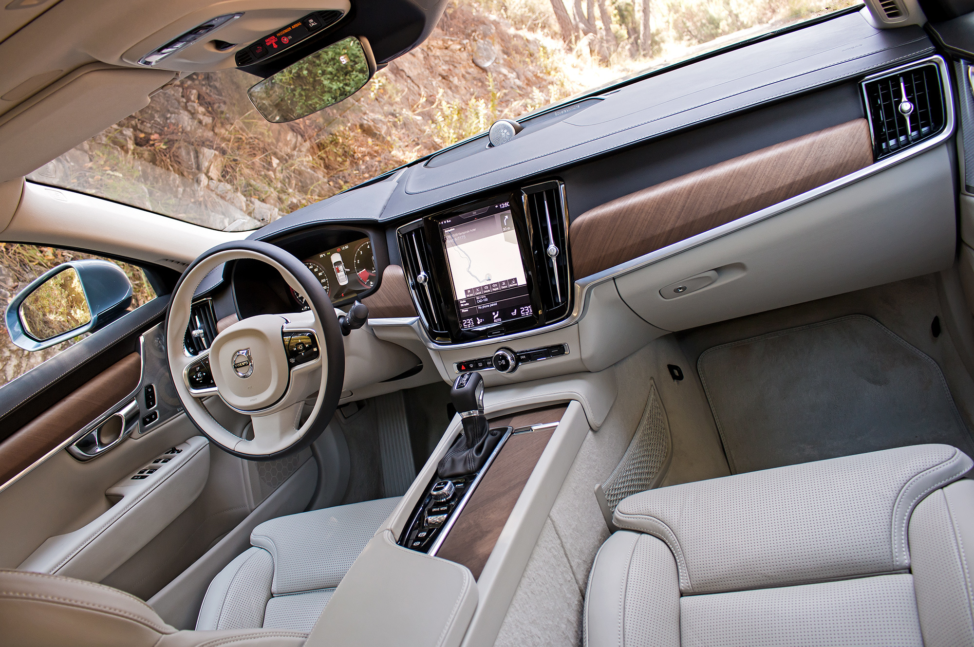 Гранёная рукоятка запуска двигателя, ролик выбора ездовых режимов — и девятидюймовый экран интерфейса Sensus. Родство с кроссовером XC90 в салоне очевидно. Здесь тот же руль, изящные передние кресла с массажем, опциональный четырёхзонный климат-контроль. Разница в том, что деревянный декор седана вдвое объёмнее, взамен горизонтальных планок воздуховодов передней панели — вертикальные, с алюминиевой отделкой в центре, а под ними алюминиевый же молдинг от двери до двери. Салон из чёрной кожи с глянцевым деревом выглядит кичливо, а вот светлый да с матовой древесиной очень уютен!