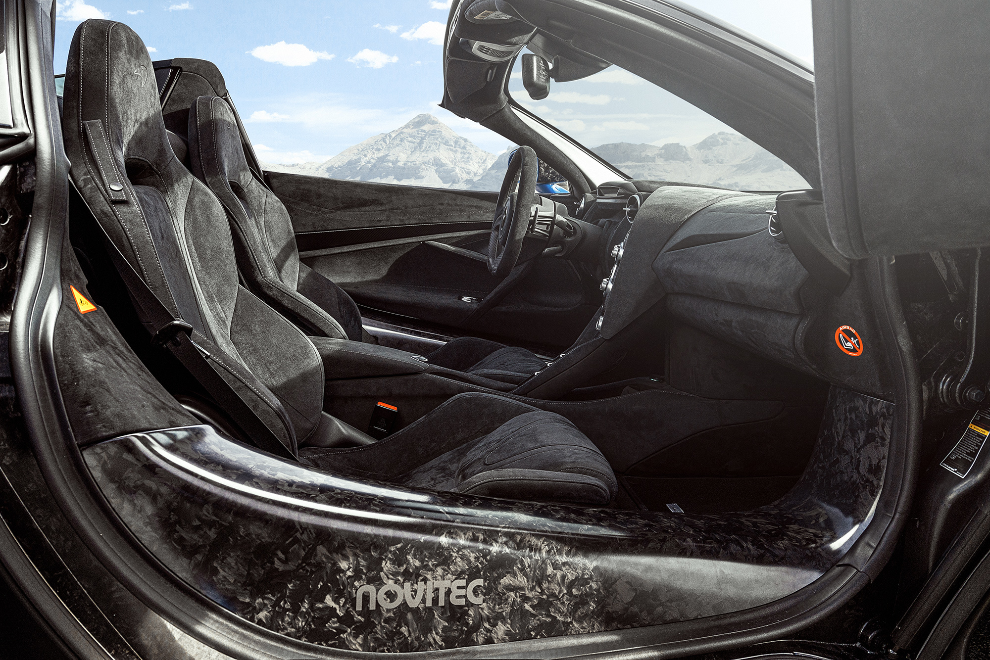 Углепластиковый обвес наверняка порадует тех, кто мечтает о суперкаре McLaren Senna (800 л.с и 800 Н•м) без крыши. Есть что-то общее во внешности двух машин. Передняя колея 720-го увеличена на 60 мм, задняя — на 130. Помимо эстетических качеств, обновлённый экстерьер от Новитека призван улучшить аэродинамику и теплообмен. Фиксированной палитры не существует — цвет кузова зависит от фантазии клиента. На колёса, разработанные в тандеме с компанией Vossen, смонтированы шины Pirelli P Zero размерностью 245/30 ZR20 спереди и 325/25 ZR21 сзади.