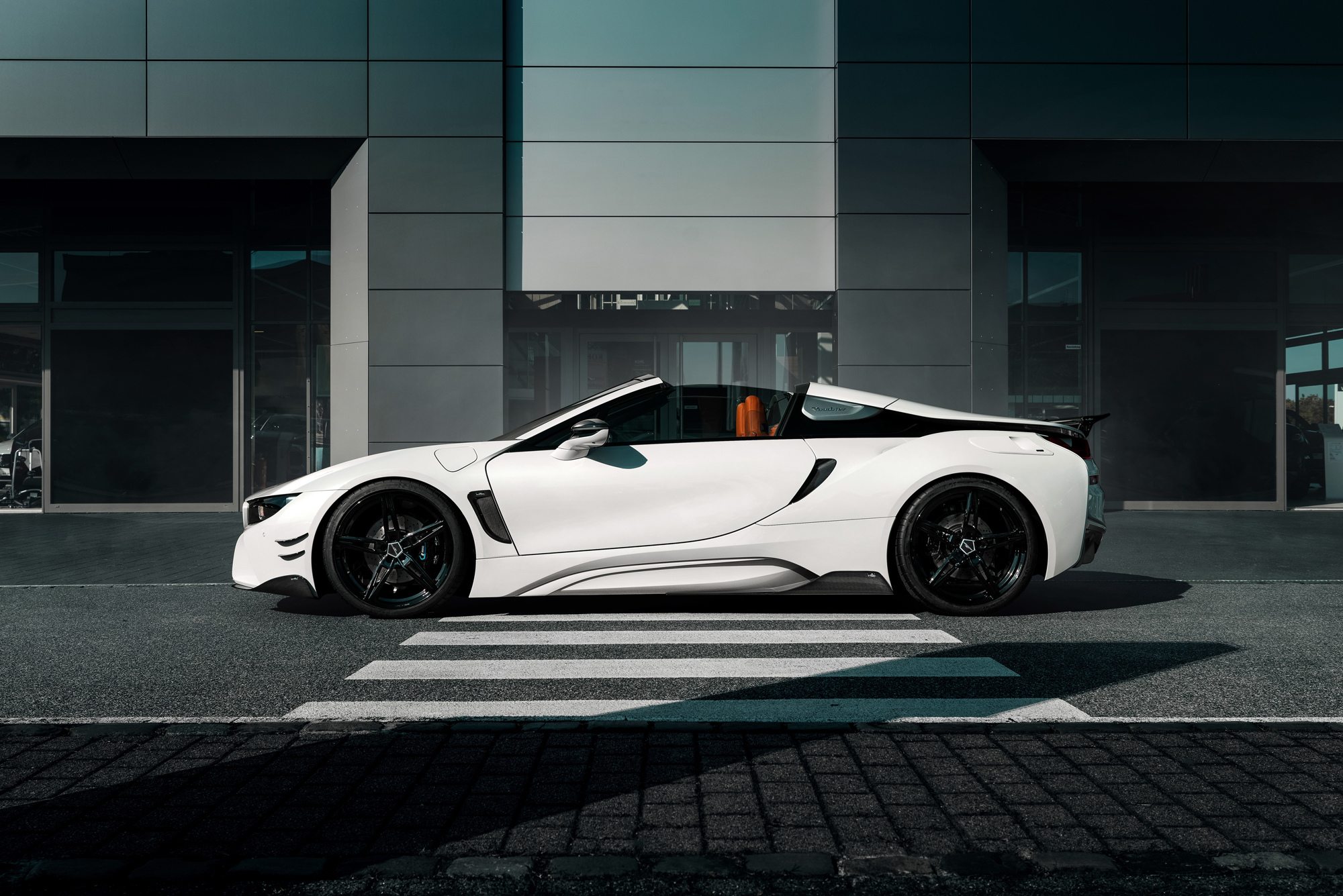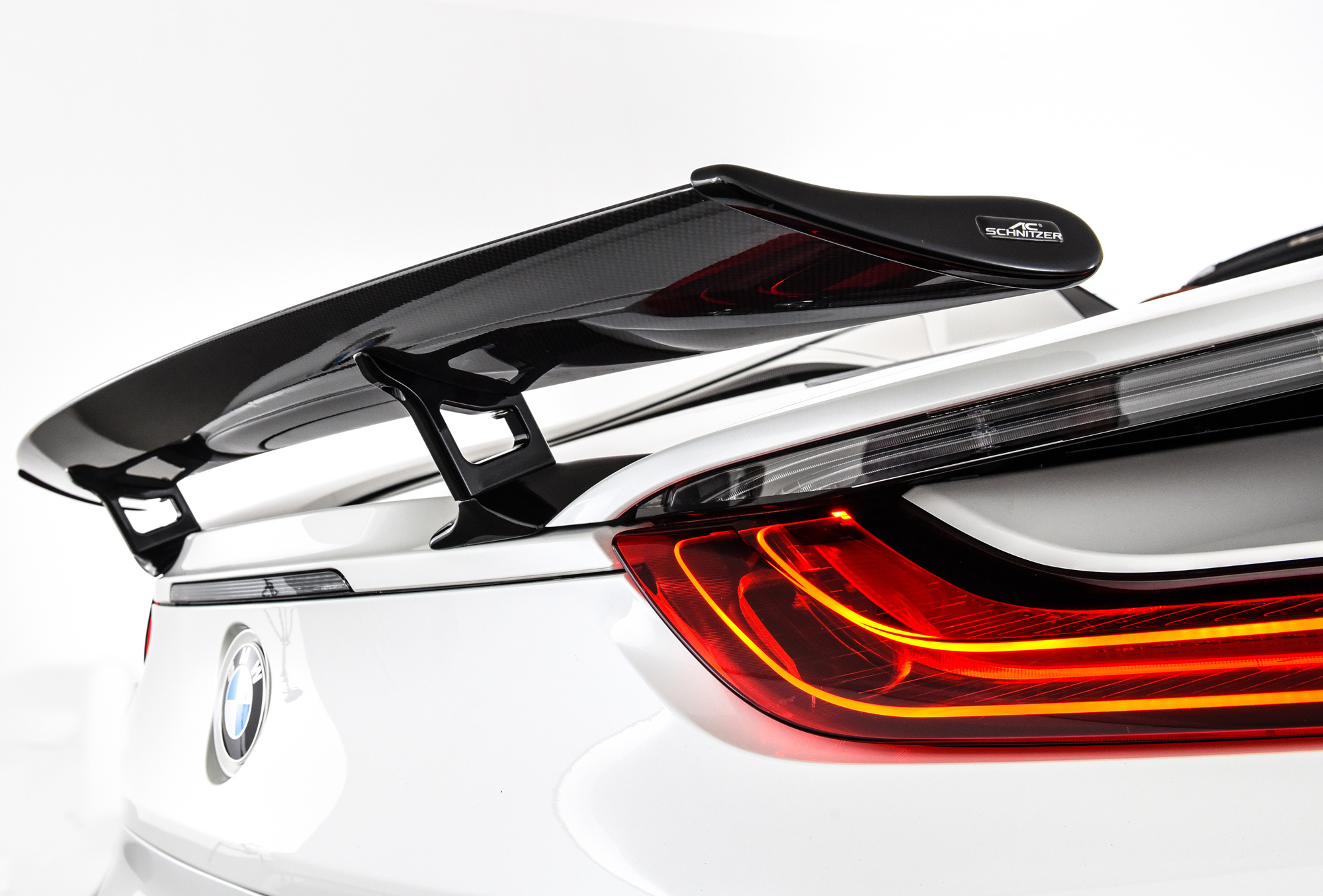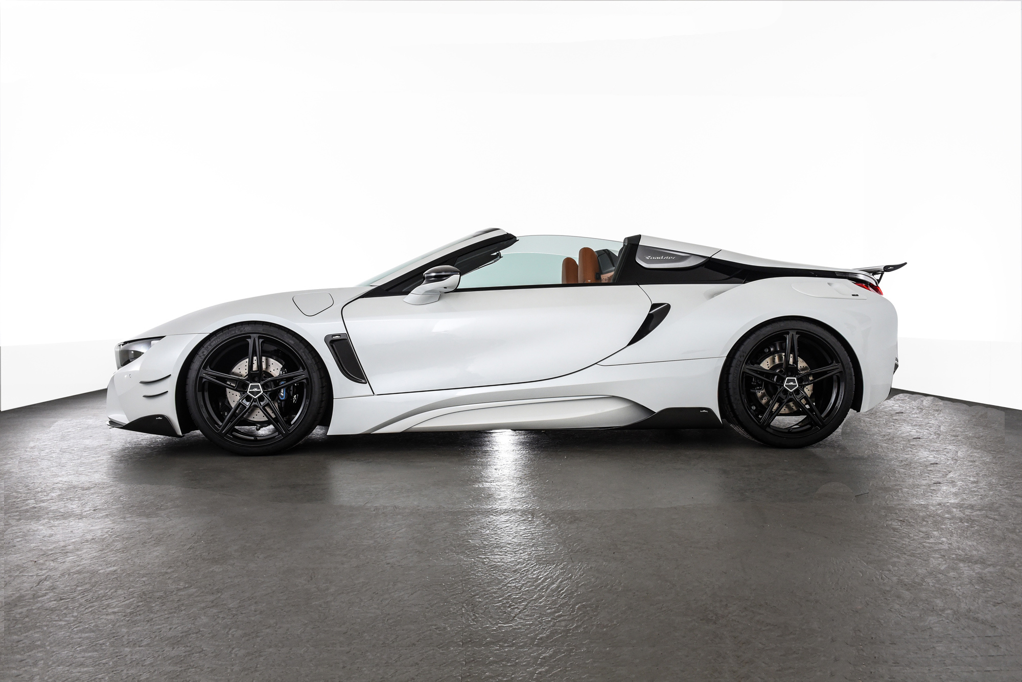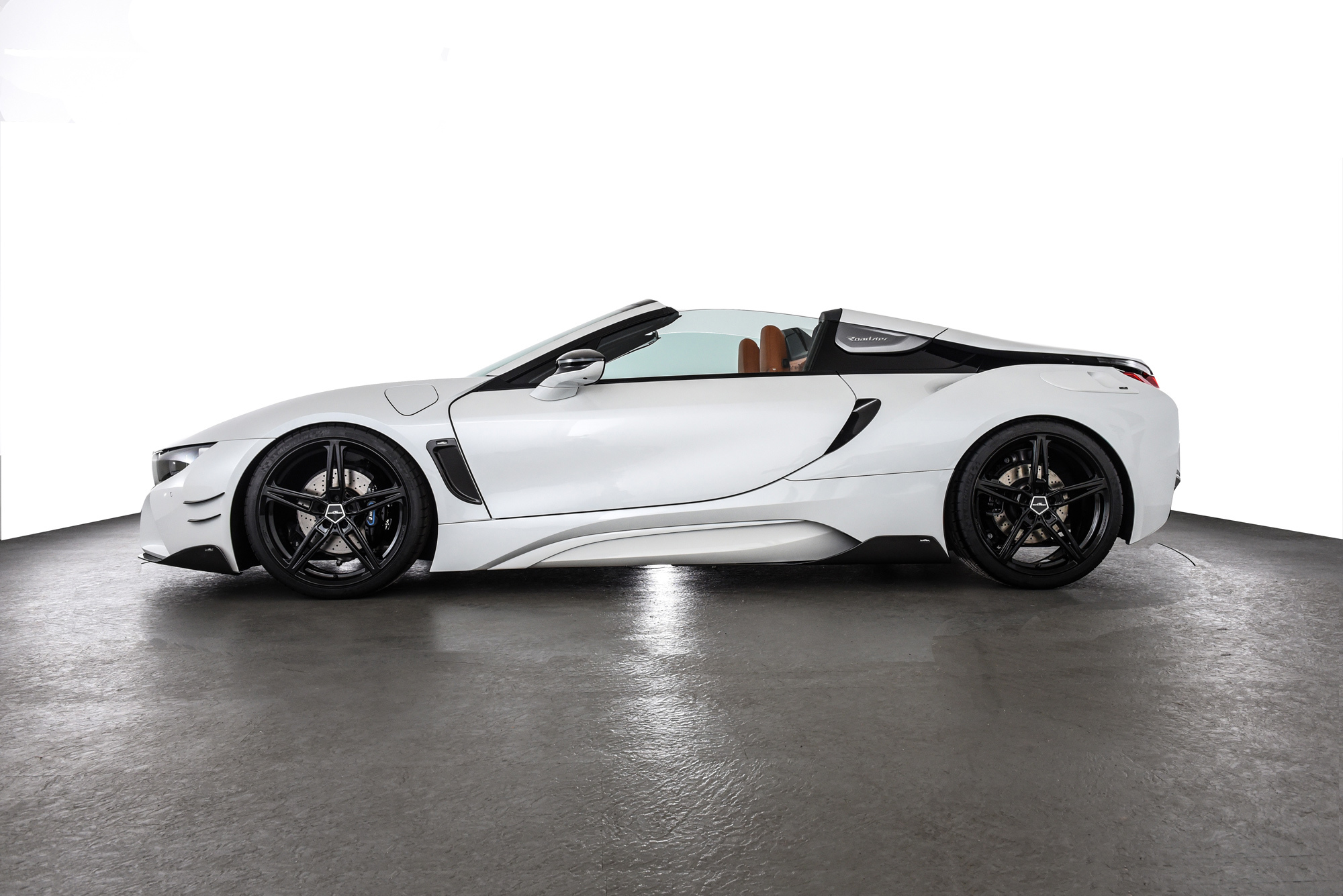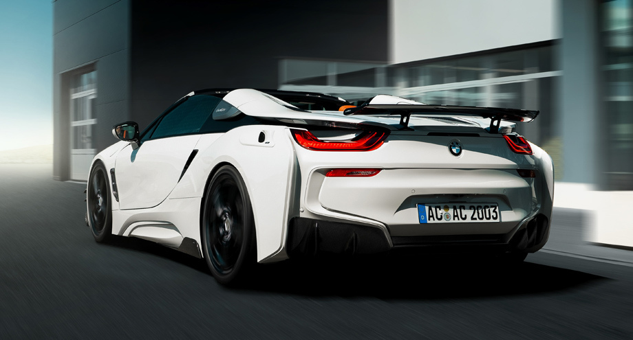 Повод поработать с открытой версий давно напрашивался. С момента опыта с купе семейство i8 пережило обновление. В числе прочего инженеры слегка нарастили мощность гибридной системы (сейчас в ней скрыто 374 «лошадки» против 362 до реформы). Ателье AC Schnitzer вмешиваться в настройки агрегатов не стало. Значит, вряд ли разгон до сотни поменялся сколь-нибудь ощутимо (у исходника было 4,6 с). Бюро подготовило новый проект по проверенному рецепту.