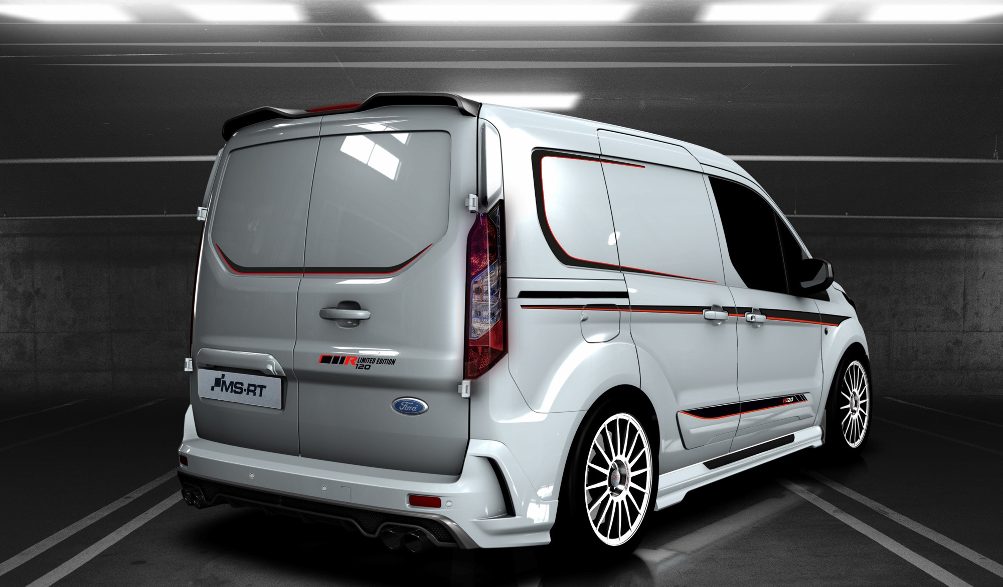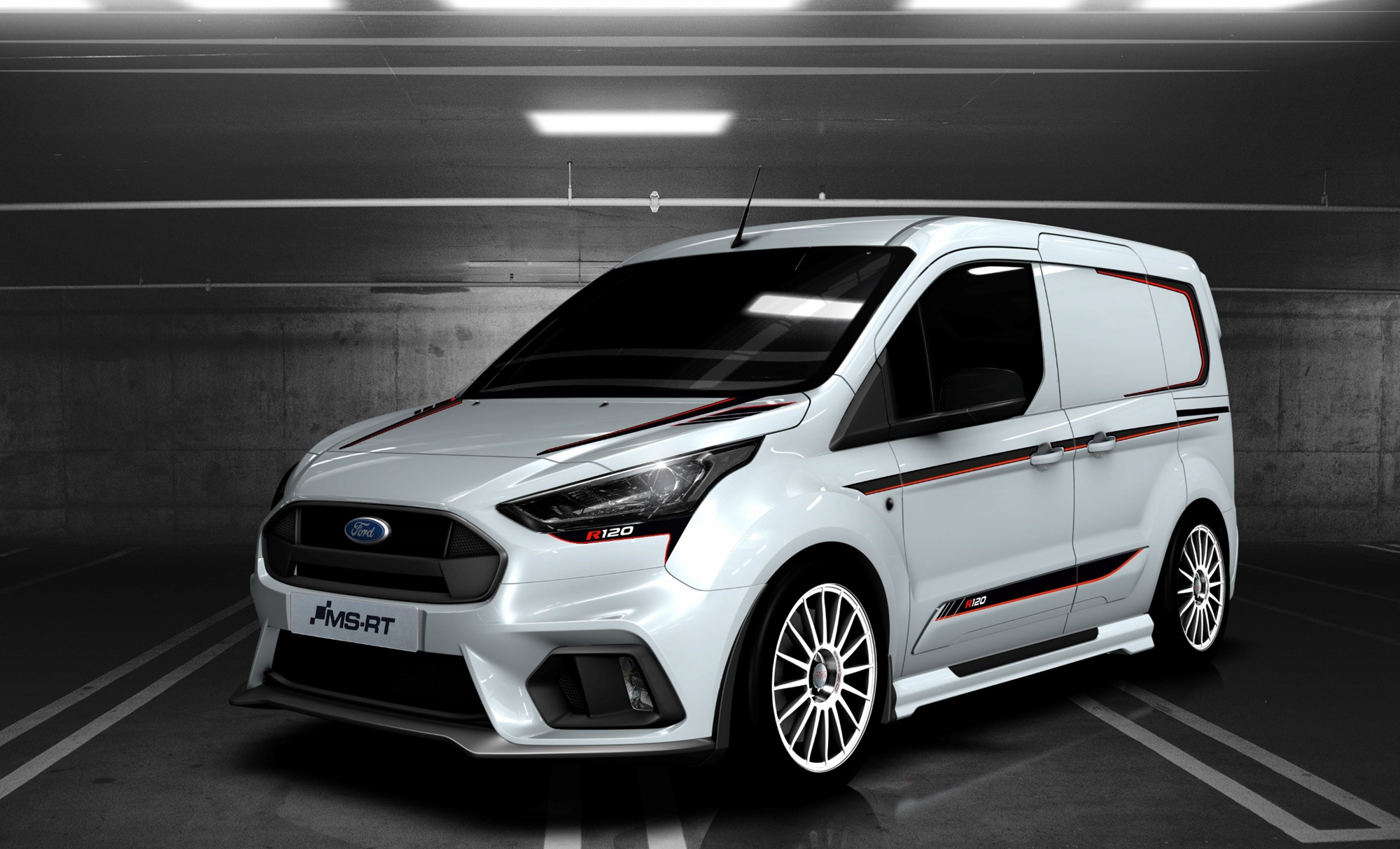 Британское ателье MS-RT представило необычную интерпретацию вэна Ford Transit Connect — MS-RT Transit Connect R120. Это визуально оспортивленная версия фургона, украшенная спортивным обвесом по периметру, белыми легкосплавными 18-дюймовыми дисками OZ Racing в раллийном стиле, красными и чёрными гоночными полосками. Внутри же обещаны чёрные кожаные сиденья с красной прострочкой и спортивное рулевое колесо из углепластика с красной нулевой меткой. В оснащение также входят чёрные корпуса зеркал, биксеноновые фары, модем Ford Pass Connect, круиз-контроль, беспроводная зарядка смартфона, камера заднего вида.