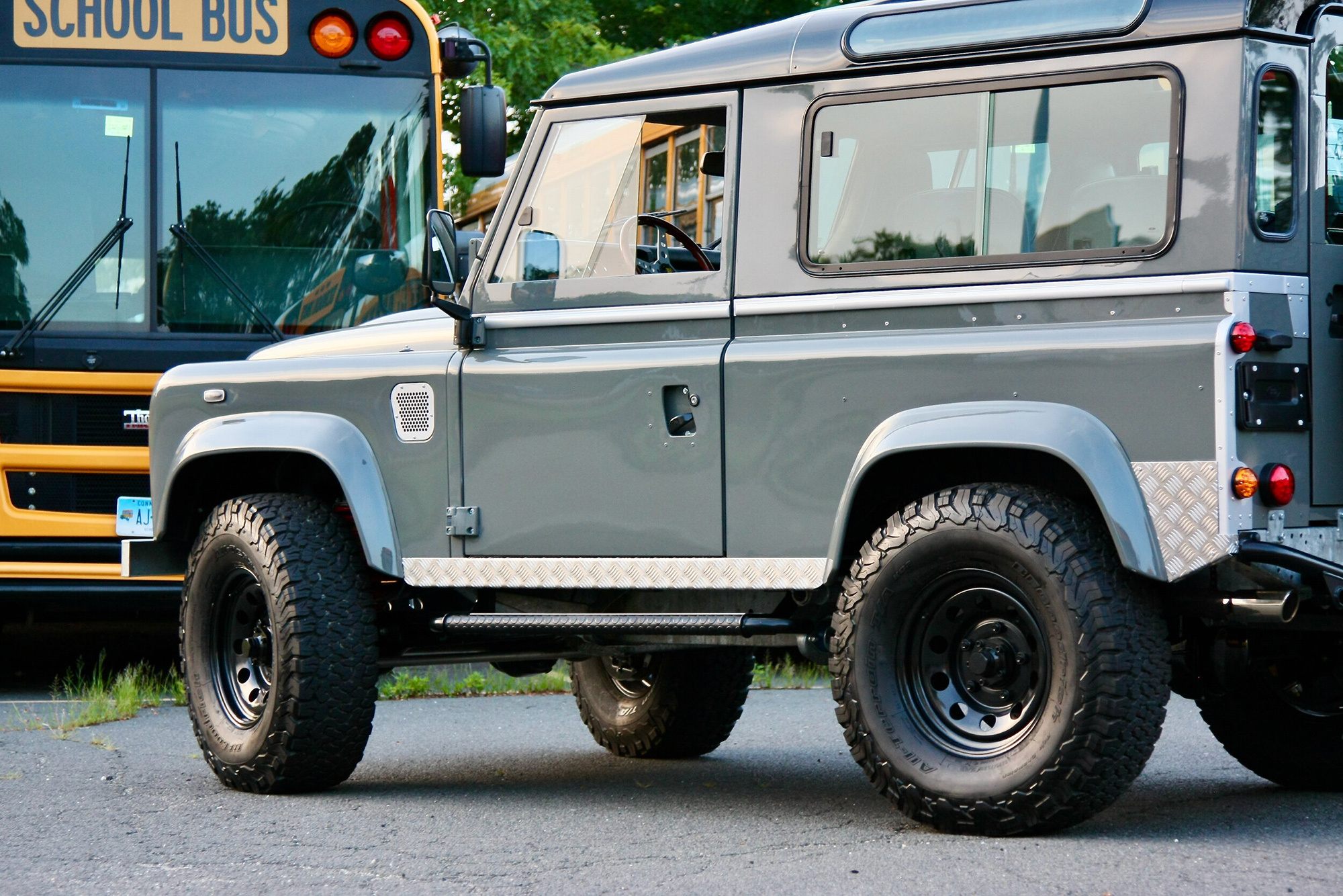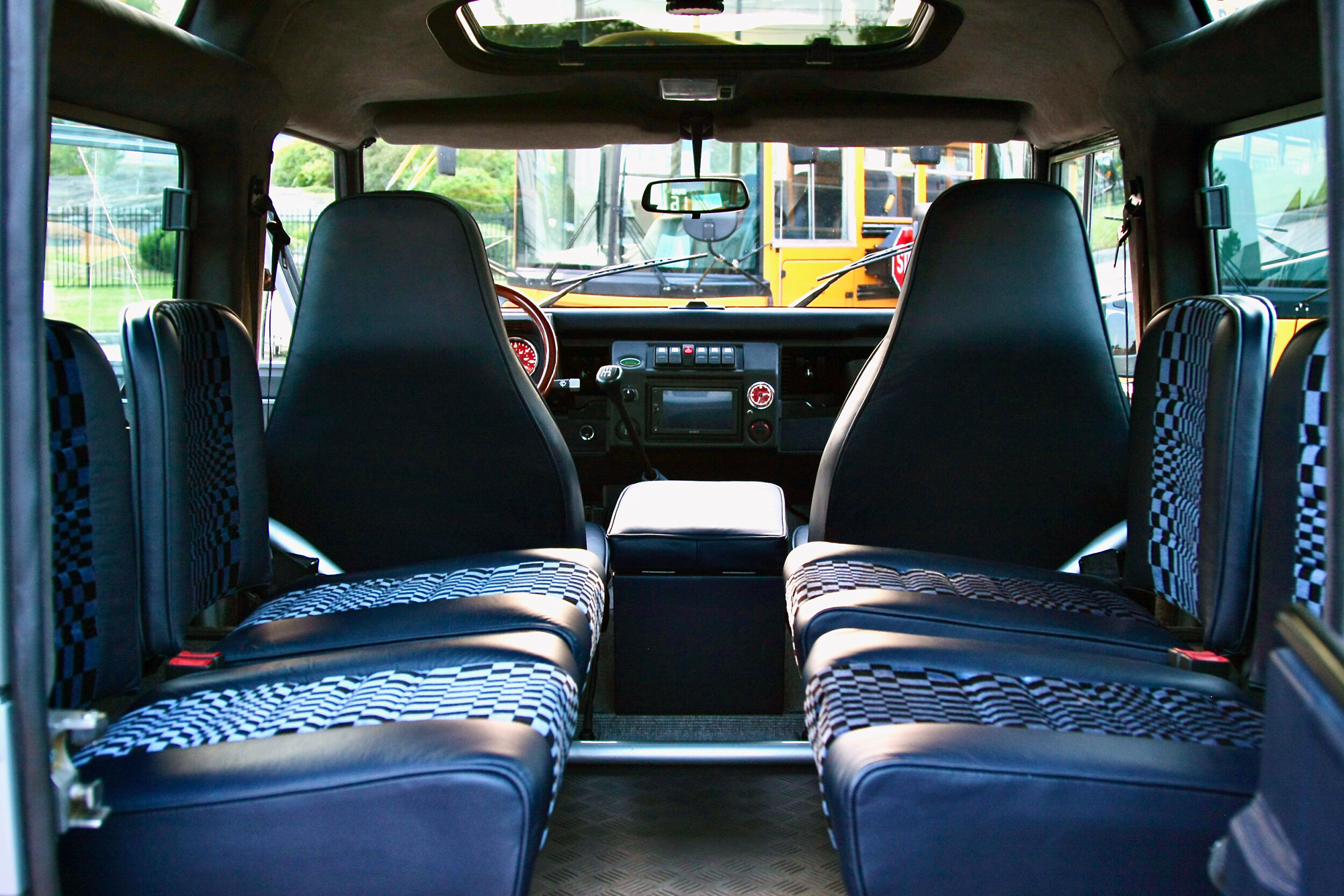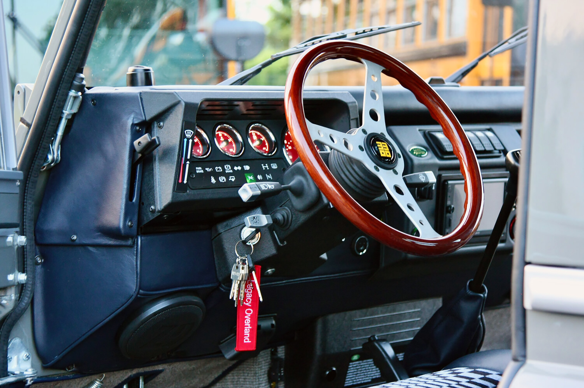 Инсталляция большого мотора потребовала усиления раздатки, полуосей, центрального и заднего межколёсного дифференциала с блокировкой. Дефендеру достались подвеска Bilstein со стабилизаторами поперечной устойчивости, иное рулевое управление и тормоза Wilwood с шестипоршневыми суппортами спереди и четырёхпоршневыми сзади. А когда клиент заглянет в салон, радости не будет предела. В Дефе стоят спортивные сиденья от Porsche 911 серии 930. Более того, передние и задние кресла обиты не только синей натуральной кожей, но и тканью с классическим клетчатым принтом Porsche Pasha. Также в салоне — деревянный руль Momo и отделка потолка и стоек алькантарой.